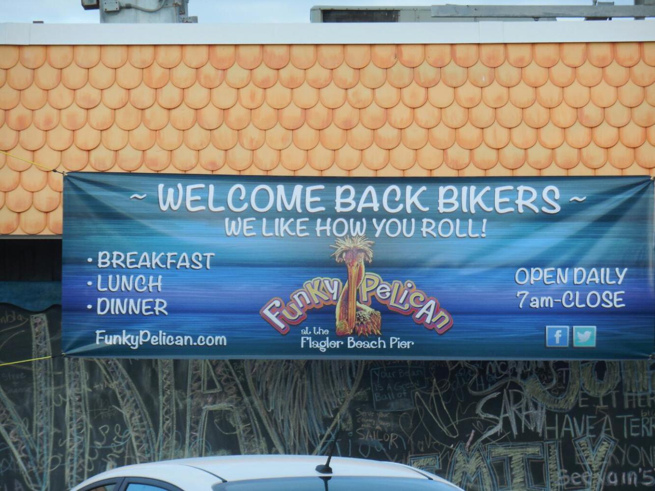 To illustrate the lack of services, at one point Dodie hung a sharp left into the garage of a vacation rental, where what turned out to be some New York firefighters were revving up their Harleys. We asked them to fill up our water bottles. They had come, we later clearly learned, because this is "Bike Week", and the place is flooded with bikers. Many local businesses (when we eventually found some) were sporting "Welcome Bikers" signs. (This does not mean us ).