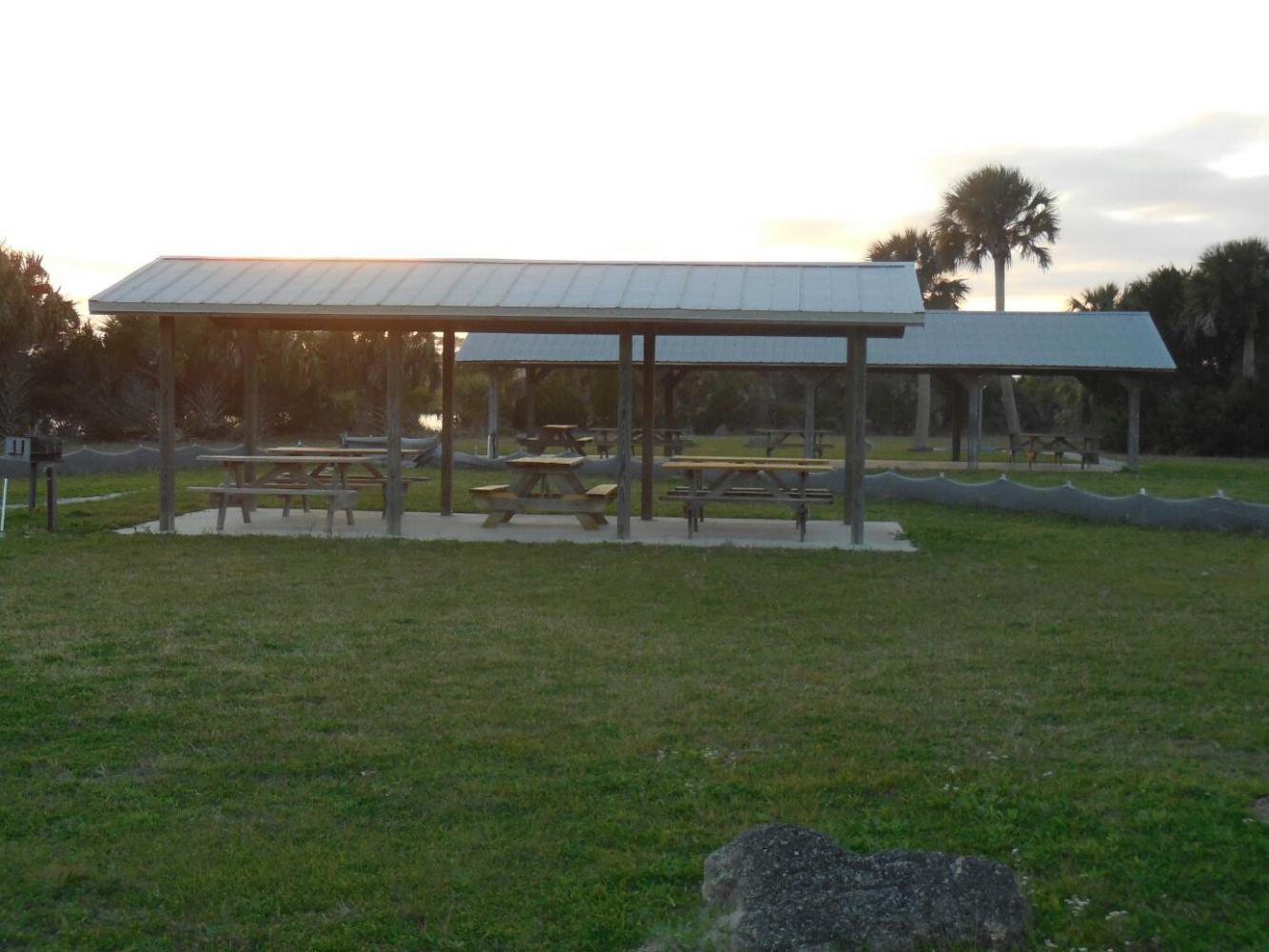 So it was that we rolled up to the Gamble Rogers State Recreation Area, a facility of the State department of Recreation and Parks. "No Vacancy" we were told. With the sun setting, we pulled out our letter quoting the departmental policy on hiker/bikers fetching up at the door. This triggered a chain of phone and radio calls up the chain of command, until I finally got the park manager on a phone that was handed to me. The lady berated me for not knowing about Bike Week, and not knowing that I needed to predict where we would make it to, and reserve (as everyone else had) 11 months in advance. I gently berated her back for not properly distinguishing environmentally evil motorized campers from angelic hiker/bikers. In any event, she sent a pair of rangers down to escort us to their huge, unoccupied, covered sheltered, multi picnic table, day use area. The rangers, by contrast, were very friendly, and did everything possible to set us up, open a washroom, offer to move tables should we wish to pitch the tent under a shelter, etc.