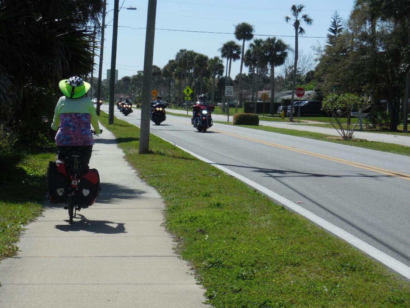 Ormond Beach is a spot where the ACA and other routes recommend ducking inland a bit. We were dubious about the need to do this, but at the intersection of A1A and 40 a runner advised us that our shoulder was about to disappear. So we turned right, and in so doing crossed the Intercoastal Waterway. This is quite a wide stretch of water at this point, spanned by at least a couple of tall bridges. Rather than proceeding as the route seems to show, along highway 1, we are noodling along beside the water. Even here, we are not immune from the hoards of loud motorcycles. A local pointed out to us that last week was "race week" and next week is Spring Break. Spring Break, though, is not what it used to be since a crackdown on misbehaviour. The local said that during the recession they tried to attract the Spring Breakers back, but with not much success. Oh well, we can't leave and come back next week, so it's us and the bikers!