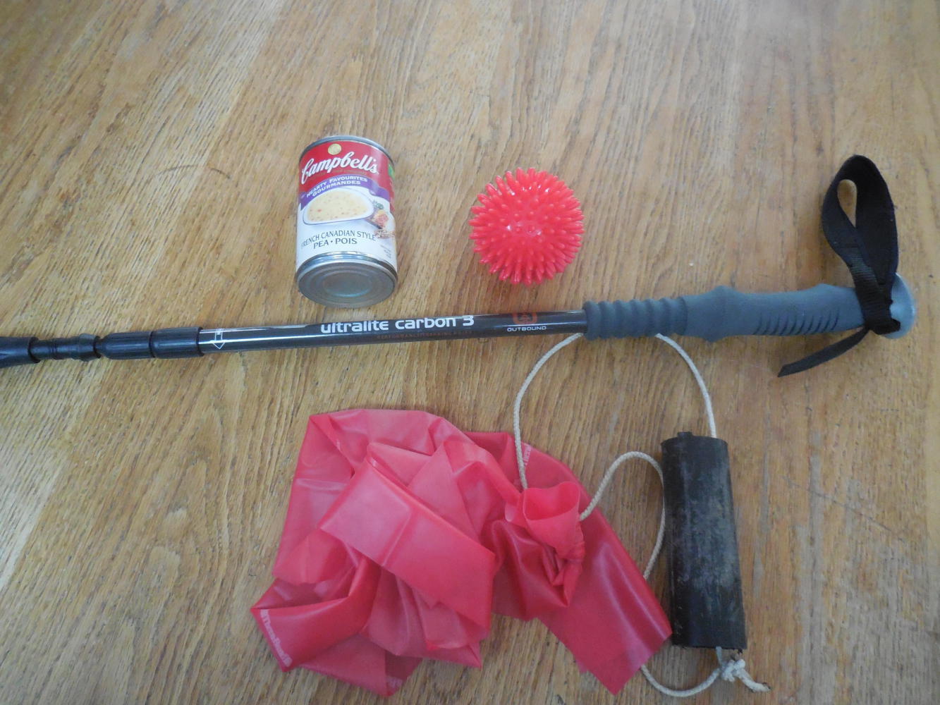 That's where the new toys come in. Failing a one pound weight, I have a can of soup. It weighs 3/4 pound, and further is "culturally correct", being a can of French Canadian Pea Soup. Then I have a studded ball, for massaging the pec minor muscle, and I have a walking stick, for helping the arm through range of motion exercise.