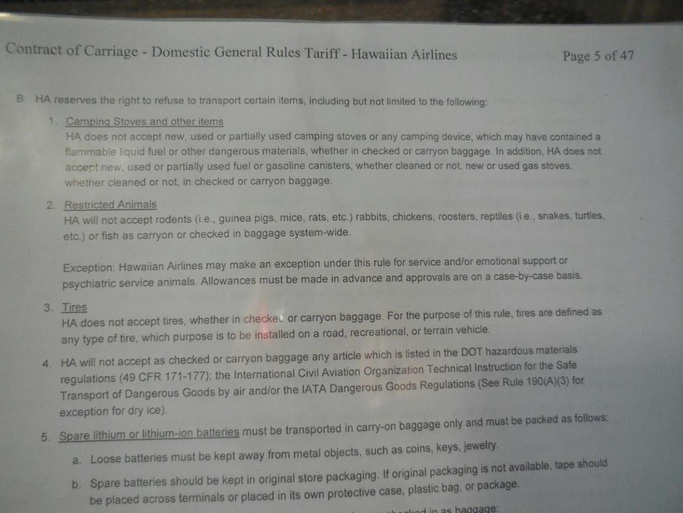 We seized on the proviso that Hawaiian "reserves the right to refuse to transport" the listed items. With the innocuous little stove in hand we asked to speak to the station manager. She was adamant. Her only regret, she said, was that we had failed to read the rules, though she did admit that this was not an FAA requirement, and was unique to Hawaiian.