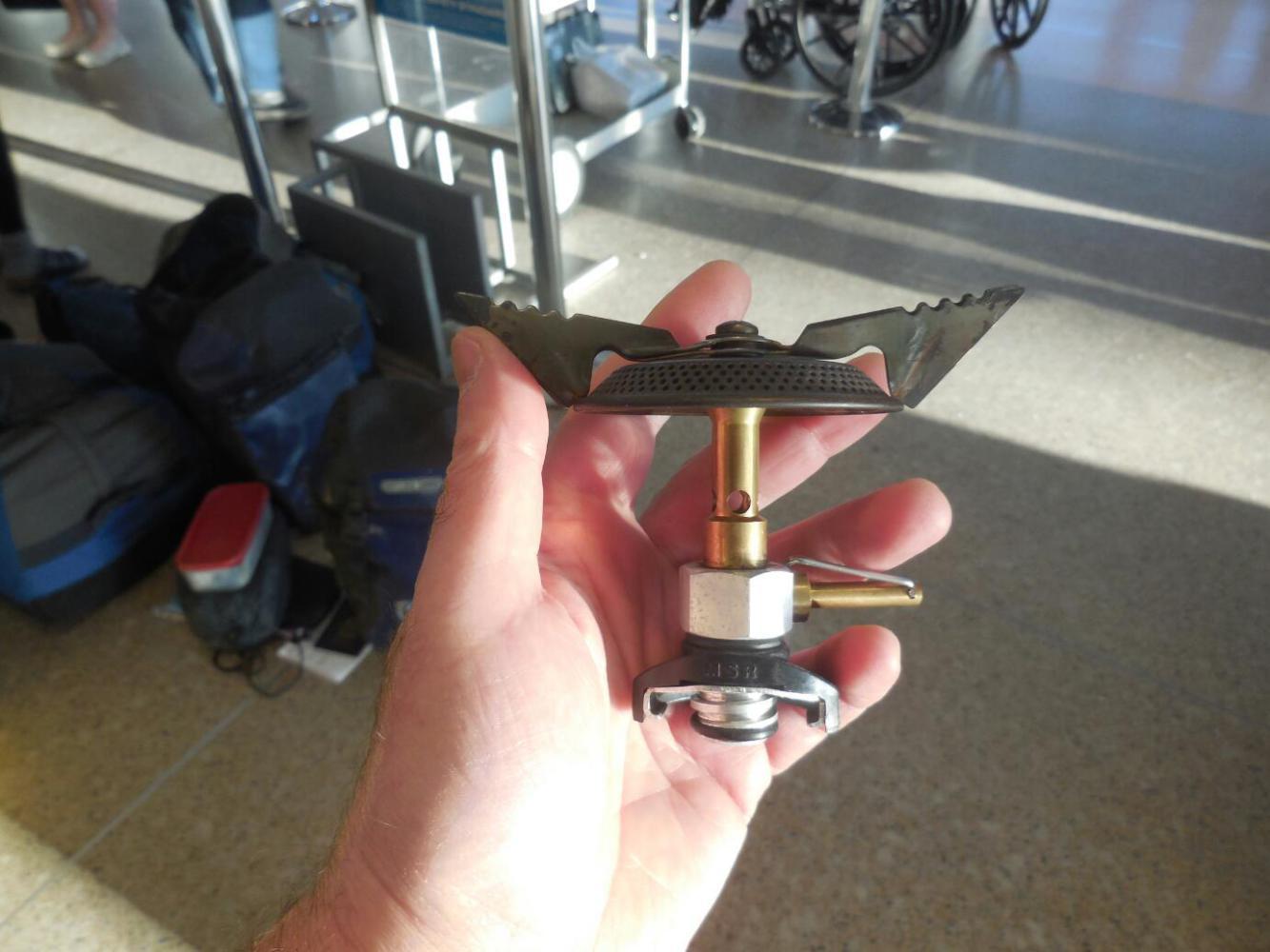 The happy illusion contnued until our bags were on the belt, and the agent casually asked the blockbuster question: "Any camping gear in there? Anything like a stove?" Conditioned to tell the truth, and knowing that we had taken care to source gas cannisters only in Kona, Dodie mentioned the MSR Superfly. The agent dragged out a three ring binder and rather enthusiastically read us out the fine print clause in the Contract of Carriage that prohibited not only gas cannisters or liquid fuel, or a stove that had once used liquid fuel (no matter how cleaned), but also a gas or liquid stove even if new and never used .