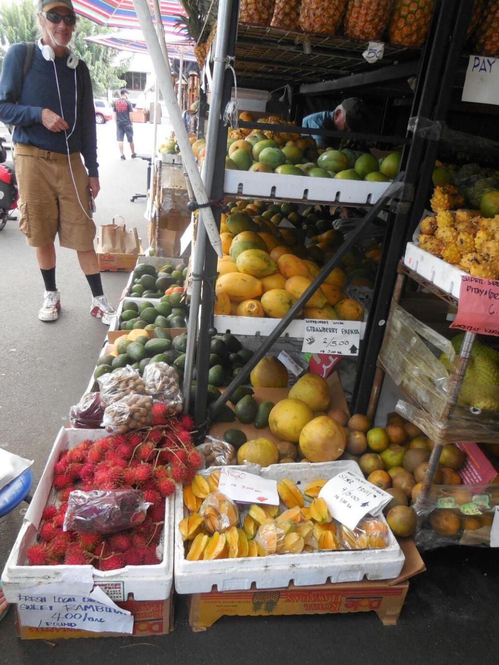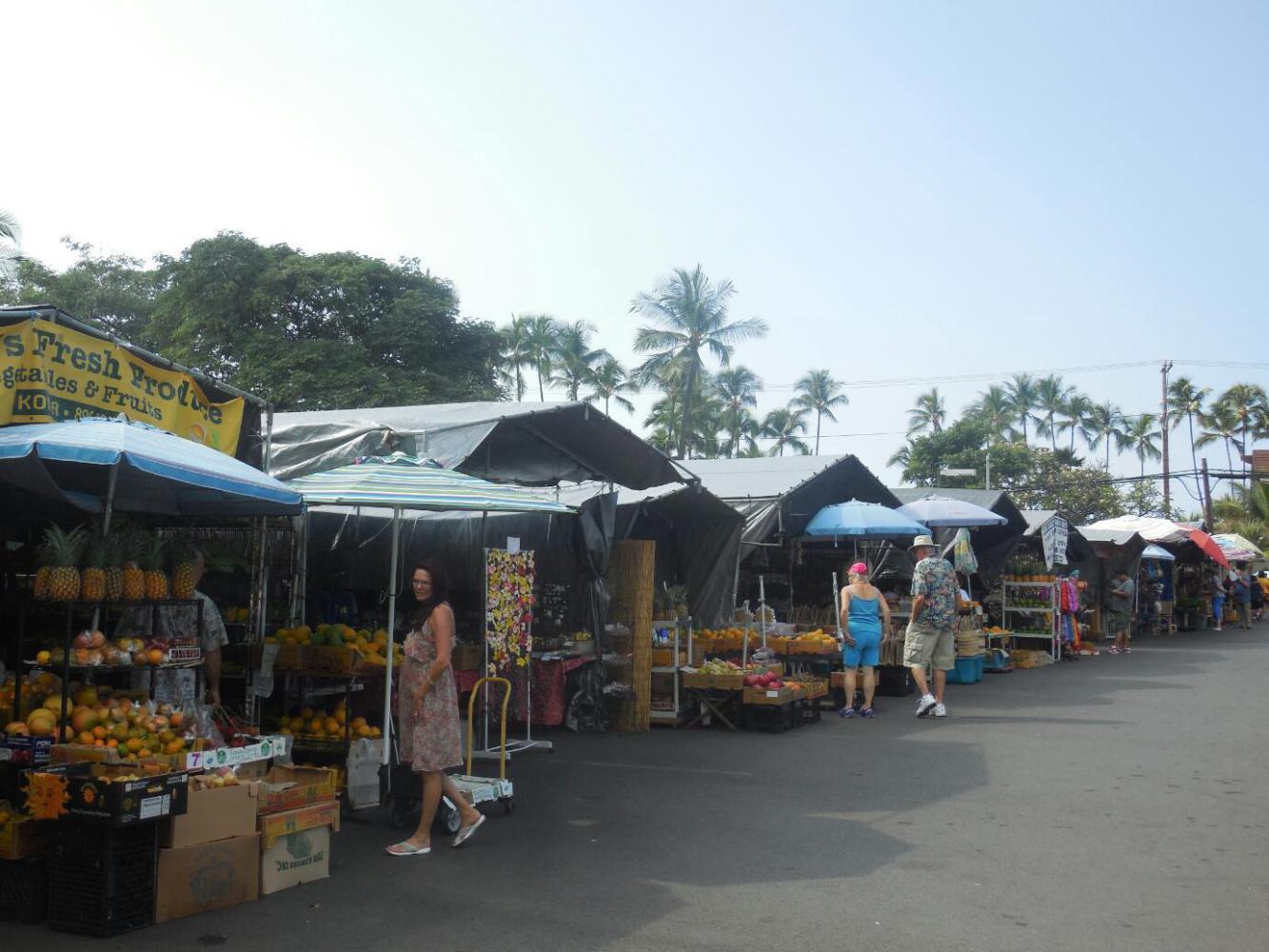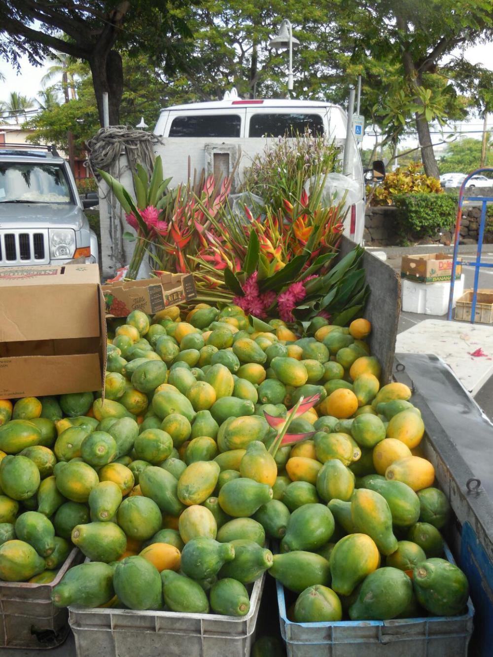 This region features several farmers' markets, and we found one in operation. Like what we remember from Hilo, the vendors rely on long metal framed tent structures - quite shabby, really. But the produce! Papayas are a mainstay. Back home, you will miss a car payment if you put your money into one of these. But here - there are stacks of them, almost free. Lots of other tropical fruits too. We went for some miniature bananas. They were a little tart, though they were not plantain. Interesting, and yummy.