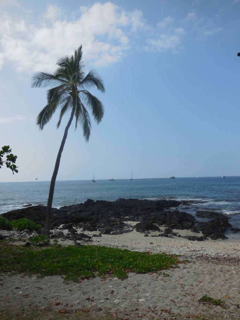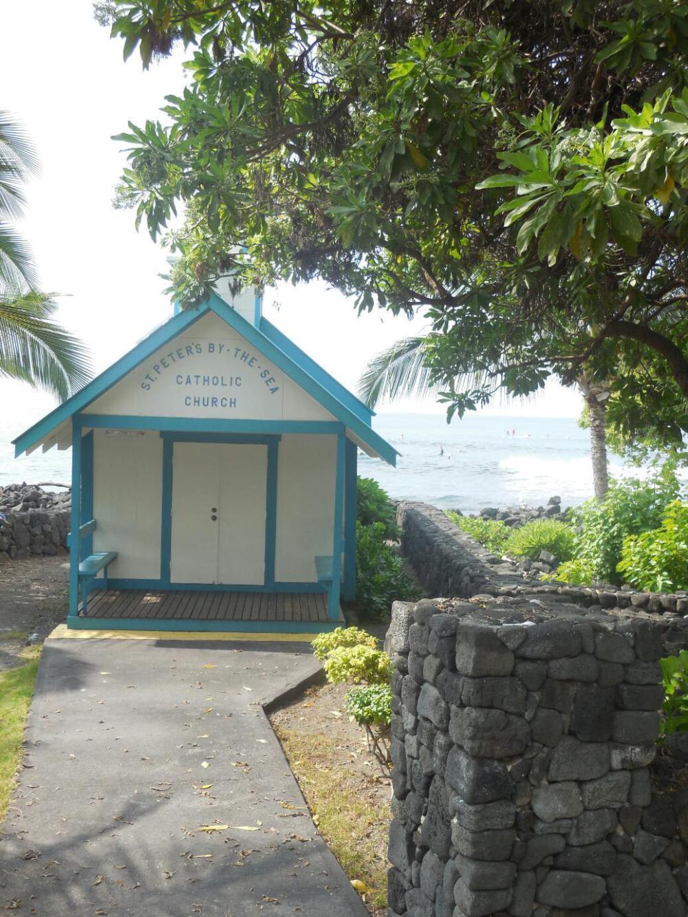 So that was our situation as we set off toward the South, on our route that would take us counter-clockwise around the Island. The first few kilometers took us along the water and the commercial heart of Kona, on Alii Drive. Commercial heart is a bit of a grandiose term, for this area does not have high traffic or glitzy malls or tall buildings. Rather there are just small businesses in small "marketplaces". On every side are flowering shrubs, and giant versions of what for us at home are delicate and costly "tropical plants". The combination of small, often weathered buildings and the lush foliage seems quintessentially "tropical" to us.
