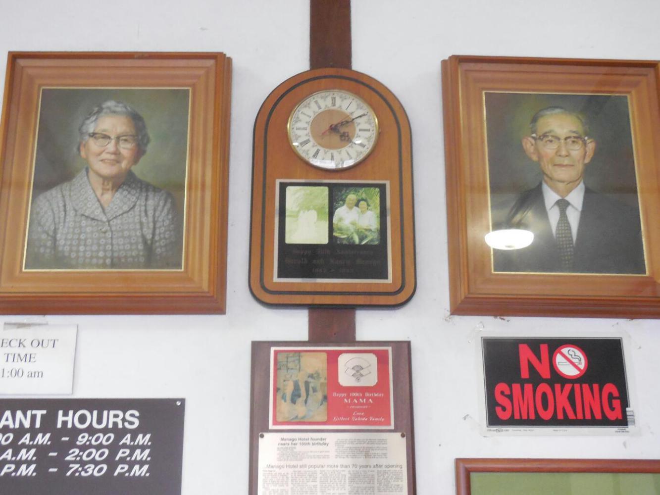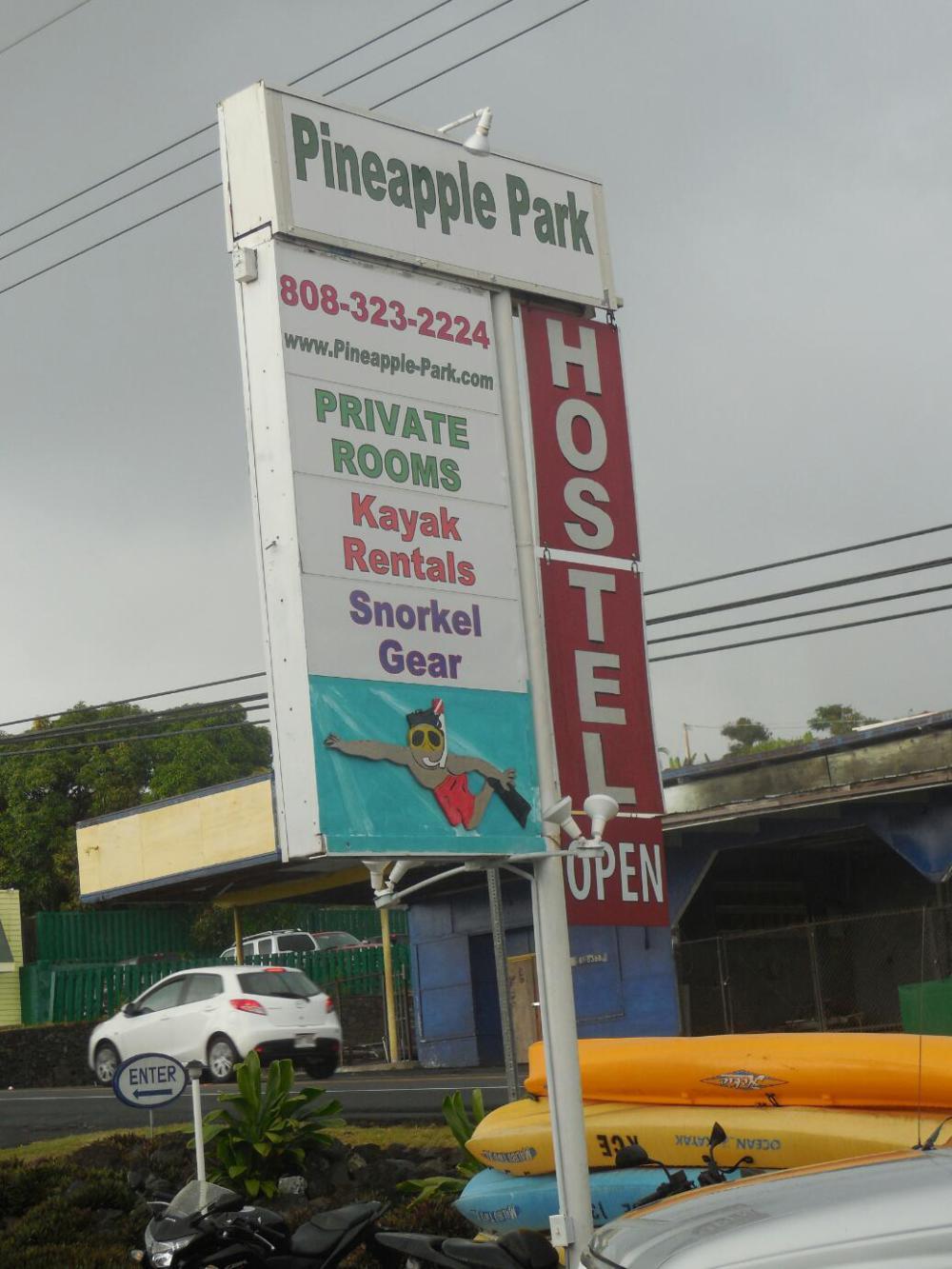 With this in mind, when we came upon a divers' hostel, and given that it was still raining, we stopped to check it out. They wanted $97 for a room of $40 each for a bed in a dorm. Bleeaggh. We pressed on. However, in "downtown" Captain Cook we came upon the Hotel Manago. This rambling establishment looks so typically Hawaiian - weathered, but surrounded by riotous tropical growth.