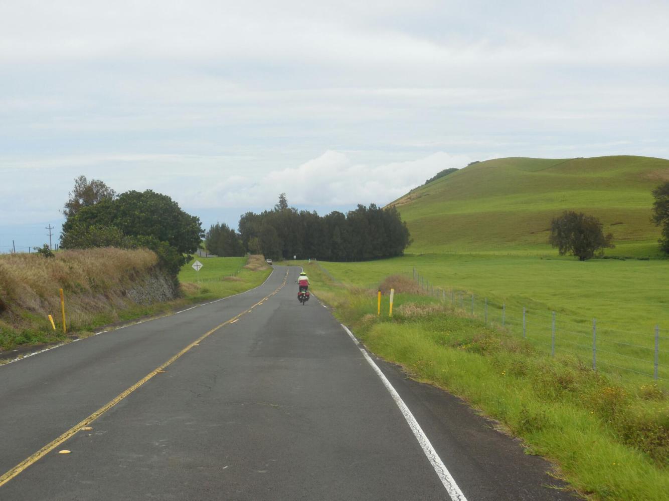 The road lead from Waimea continuously upward, for 12 straight kilometers. By the time we reached the crest, we were at 3564 feet! Now came the crazy part - 20 km straight down. Straight down means we did not have to pedal, at all. Even pokey us, leaning on the brakes, could easily go 40. It was a little freaky, because I kept thinking how tiring it would be to be climbing up this thing, And to be fair, we had climbed it, because we started at sea level at Laupahoehoe. So now we were just collecting on our previous effort. For anyone thinking of cheating, though, this would be the one for getting a lift to the top and gliding down!