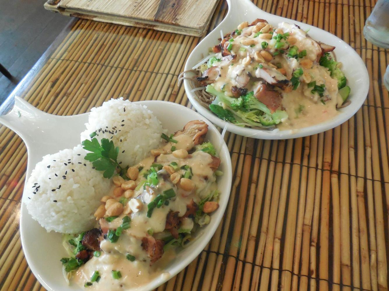 After ditching our stuff in the room ($75) we headed for the Bamboo restaurant, which we had read about in our guidebook. Here again were all the style elements mentioned above, in a spacious 100 year old, renovated building. The food was some form of Pacific fusion, and we really liked it. The dishes we chose were both some form of chicken on vegetables with coconut sauce. Mine had sticky rice and Dodie's had soba noodles.