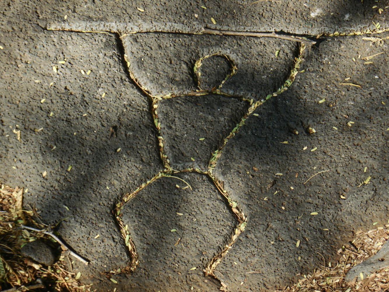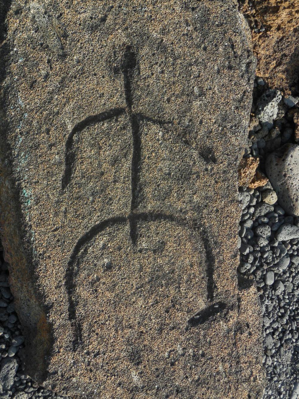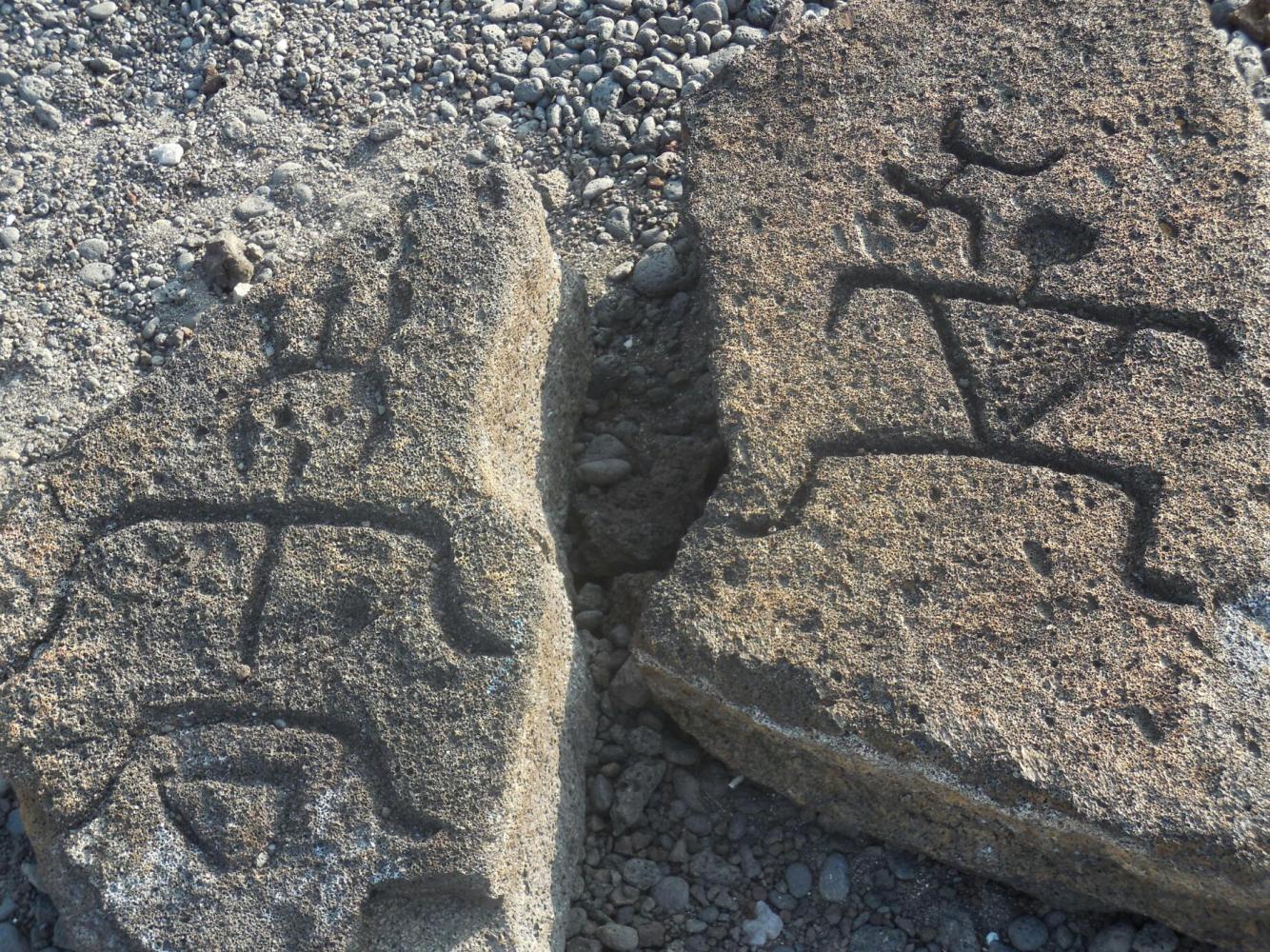 The lady advised us not to stop at the first petroglyphs, but to press on. We already knew that the trail ought to be 1 km each way. But when we got to the first petroglyphs, any further trail seemed to be rough and poorly defined. We were happy with the first ones, though. The designs seem bold, and strangely modern. Soon there will be photos of some of them just below.