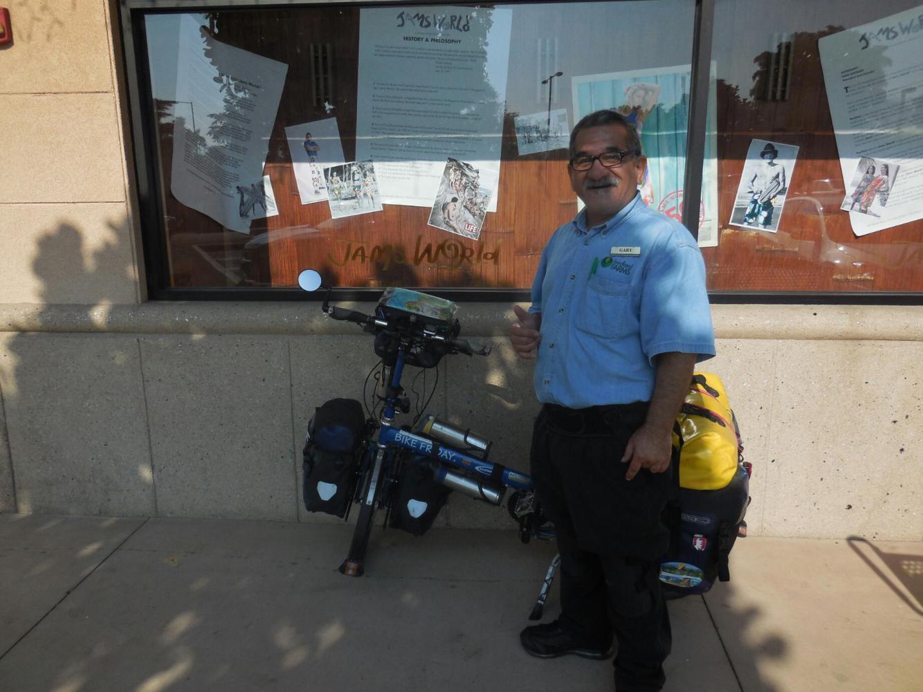 As we were unlocking the bikes and puzzling over what the store's problem might be, things got more complicated as another worker, "Gary", came over and asked us the Usual Questions. What was unusual was his reaction. He was really wowed. He said we should be on TV, that a crew should be following us. He mused about how lucky he was to actually run in to us. Now I confess, I have also thought the same thing! That is, that people who meet us may not be fully appreciative of meeting the real Grampies! I expect half or more of you reading this feel like throwing up. But I bet all but the most truly modest of you have thought this about yourselves from time to time. Anyway, thanks Gary, and we feel lucky to have met you!