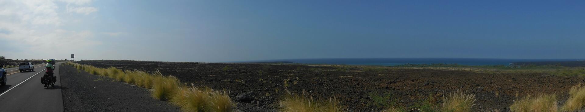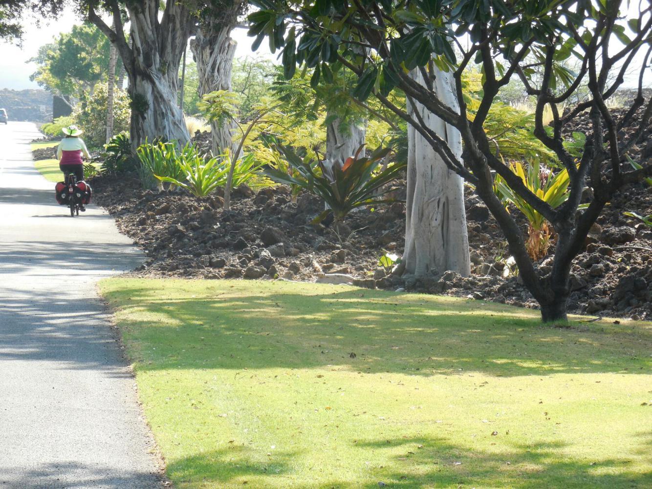 Back on the highway, we mightily enjoyed the extra broad shoulder. This continued all the way into Kona. There were even little touches like Share the Road signs for when the road reached an intersection and might have people turning across the shoulder/cycling lane. Sometimes there was even a dotted bike lane in these situations. However, in the 50 or so km between Foodland and Kona, there was only one potential water or snack stop, at Waikoloa Road, which in any event was not far from Foodland. The road gently rose and fell, so no problem of hills, but it really was travelling through a lava desert, and with the unrelenting hot sun, it was good that we had brought enough water. This turned out to be 5 litres for Dodie and 3 litres for me.