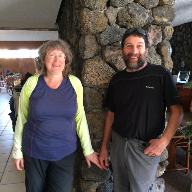 We chose Hawaii for this trip as a warm place to cycle with Winter coming on back home. We had always found Hawaii attractive because of the five harsh volcanoes on the one hand, and the lush tropical environments on the other hand. Because the basic distance around the Big Island is just 500 km, 700 km with side trips, we looked on Hawaii as just a short and easy spin. This turned out to be a misconception. Even without problems that cropped up with Dodie's knees (and back, and also shoulder), Hawaii is only truly easy only if you just hang out at the beach. Locals know that the hills, deserts, and rains can make it very challenging. Before returning, we will be making sure that the knees are good and/or that the route is carefully planned to take advantage of the relatively few affordable B&B's or hotels.