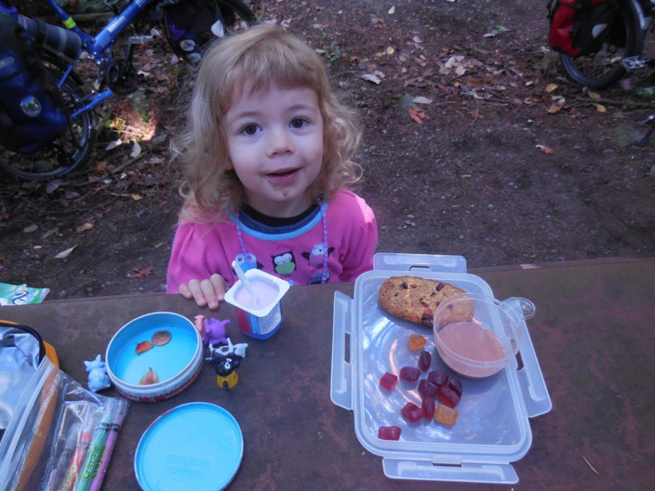 Since we had decided not to bring the stove, breakfast included gummies (wholesome fruit juice based ones - oh sure), cookies, and chocolate milk. Predictably, Amelia seemed OK with this.