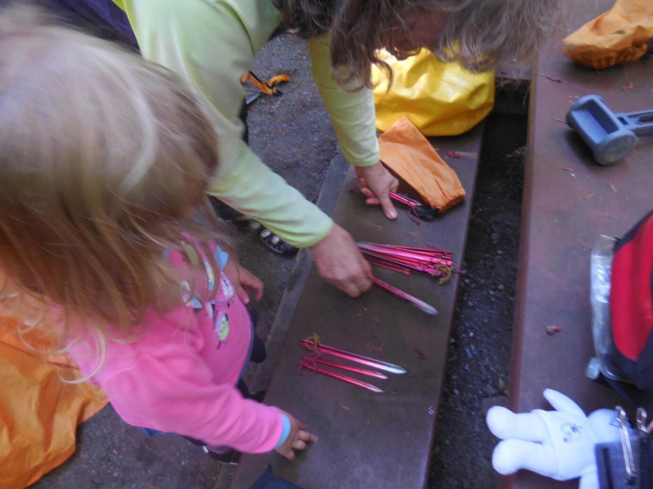 We took down the tent, with Amelia carefully counting that all the clips were removed from the poles and that all pegs were accounted for. The tent uses a hub system, which means that all the poles radiate from a single point. We call the whole thing the "spider". Amelia was quite taken with the spider and insisted on holding it in her lap for the remainder of the trip!