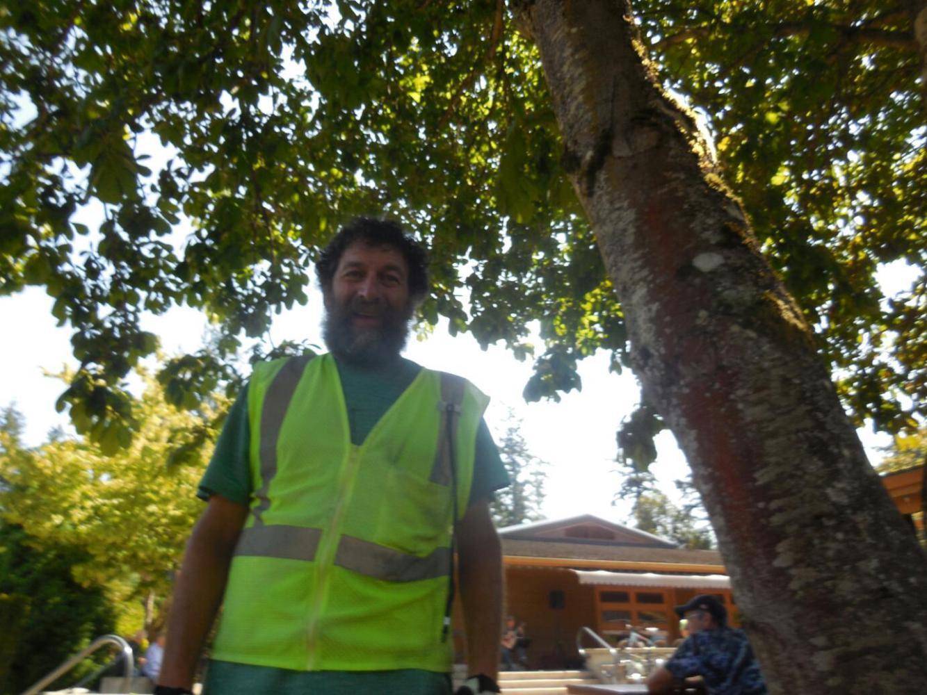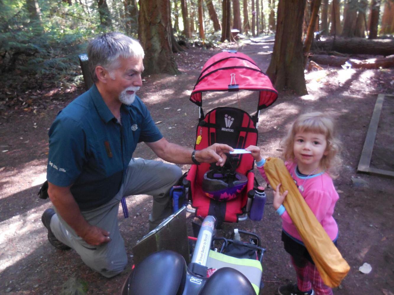 Eventually the ranger came along and said hello to us. He agreed that this campground was really great, and somehow little known. It is part of the Gulf Islands National Park, and is the only component not exactly on an island (ok, Vancouver Island is technically an island. The ranger is married to someone from the south of France, and so was very familiar with the style of camping practiced in Europe. He said his wife, too, appreciates being in a trailer and off the ground. Amelia gave the ranger one of her "business cards" so he can further follow her adventures.