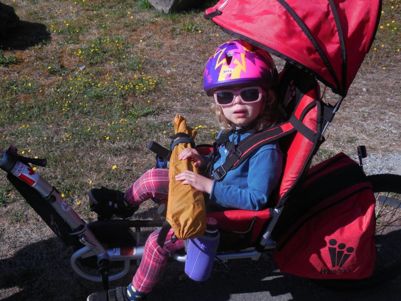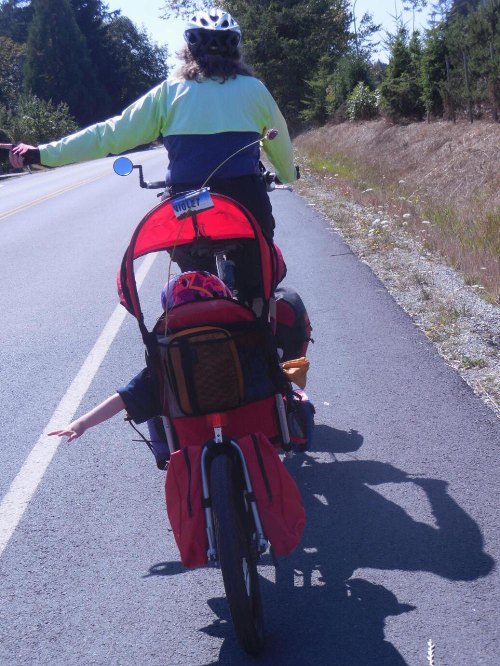 I went in to the bakery to make our purchase, and came out to find Dodie and Amelia fielding the first Usual Questions of the day. This day we did not run into any further people who already knew the Grampies, but the combination of the Bike Fridays and Weehoos drew comments and questions all along the trail. Most questions were about the actual gear, but because we look like we must be on a round the world trip, people also commonly asked where we were from and where we were going. Did we just come off the ferry? they wanted to know. And if we were stopped for any reason, people asked if we needed help, advice, or directions. We never feel impatient with these inquiries from the kind people, but it is embarrassing to admit that we are from "here" and are heading to Aunt Karyn's house. I considered using the cagey answer that we are heading "toward Mexico", which technically is true!