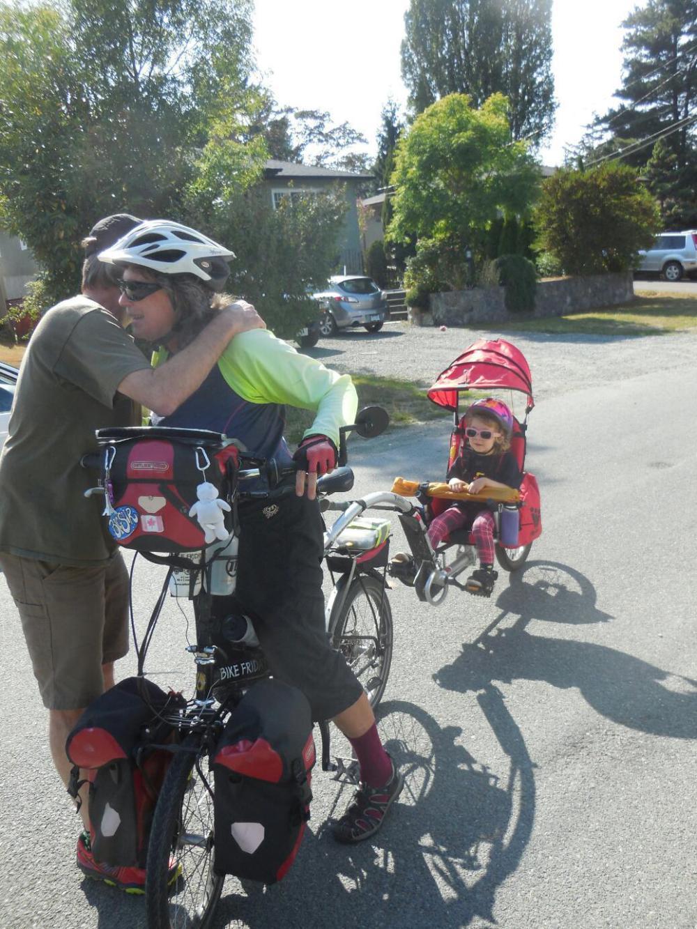 The rest of the ride was, as we know, dead level, and passing over fun bridges and trestles. Eventually, it goes right by Karyn and Erhard's house. Erhard was there to give us a welcoming hug. And so, it was done, Amelia's first overnight ride!