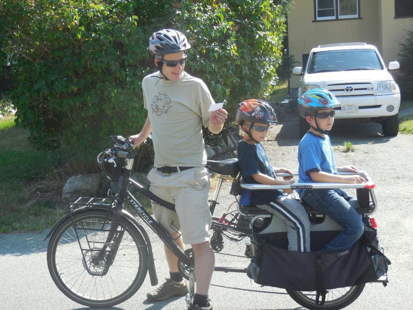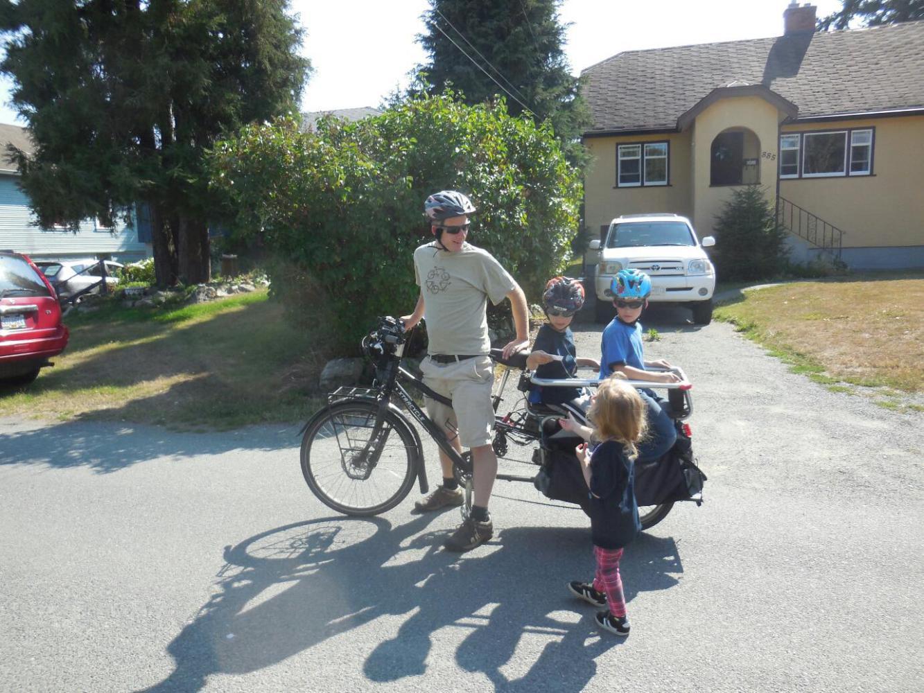 1. As we chatted about the ride with Erhard, along came two boys on the back of a long tail, electric assist bike. They had great places to sit and rails to hand on to, plus protection for their feet. Have a look!