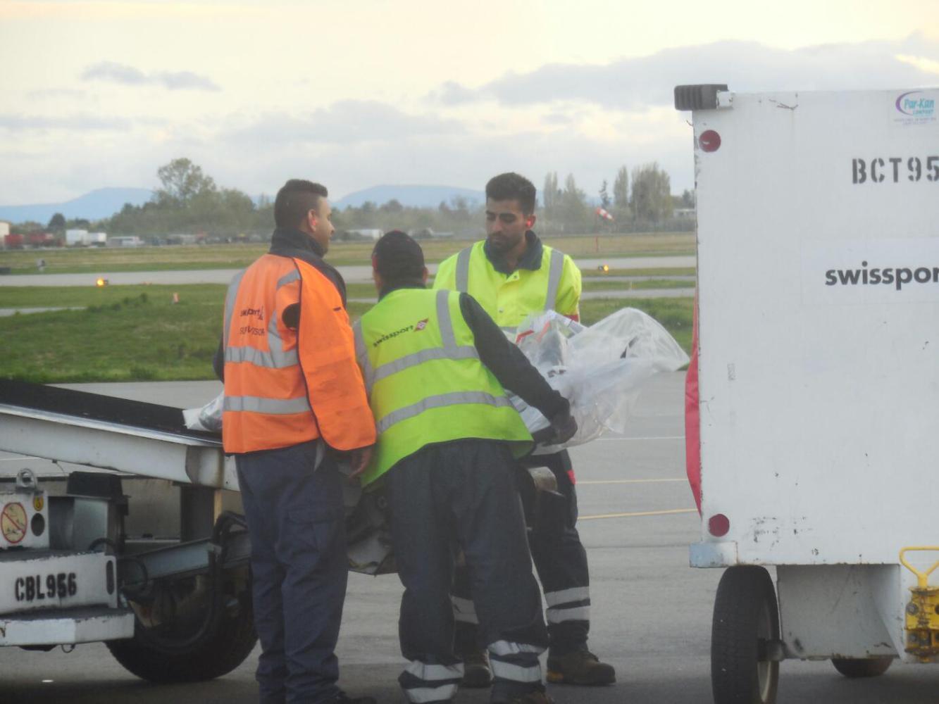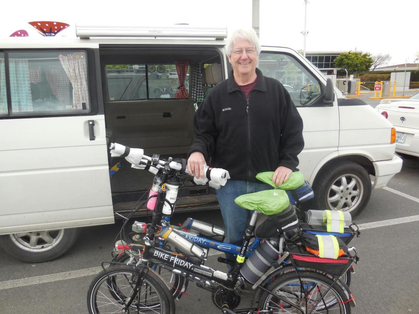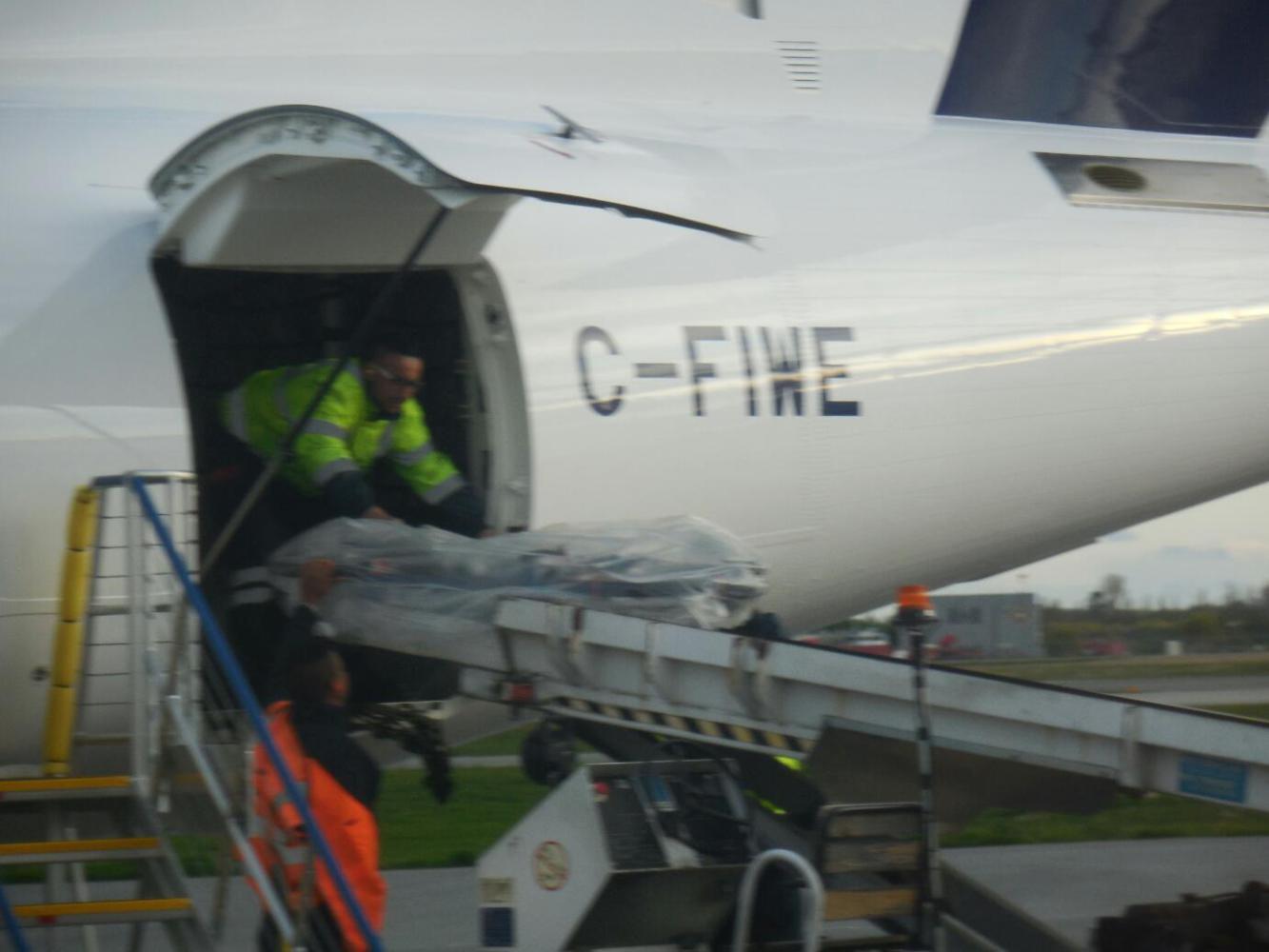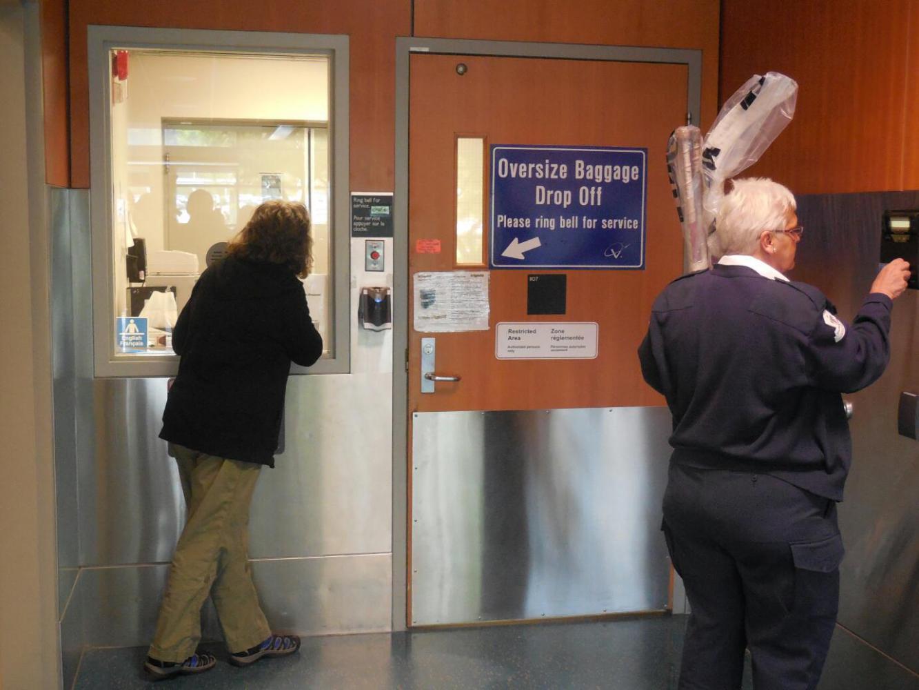 Another advantage of our little plane is that we left it on some portable stairs and walked a short distance to the terminal at Vancouver. So we paused to see just how well they did in unloading the bikes. In fact, they were very careful, with one baggage handler at each side of the horizontal bike, lifting it carefully. However, because the oversized baggage lady had not reclosed one bag well, a handlebar poked out forlornly. Two more plane transfers and the bag could easily be in tatters.