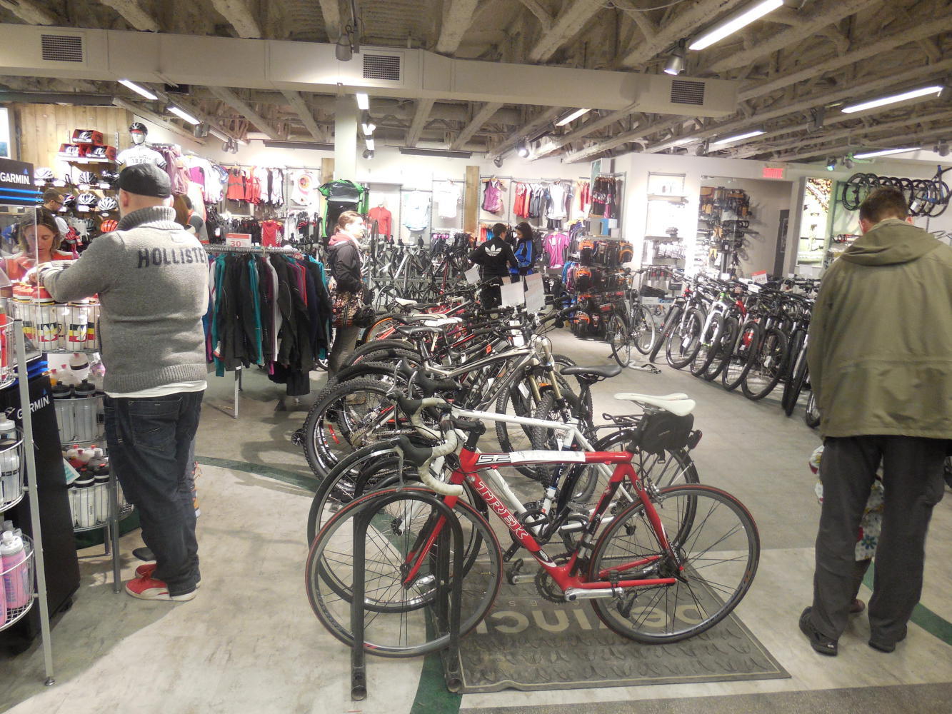 To my surprise, the bike shop was open here in Quebec on a Sunday, and we scooted over, fifteen minutes before closing. Rather than find the place forelorn and deserted, it was humming with people, carrying off the lovely Canadian made DeVinci bicycles, and setting up their little kids in bike trailers.