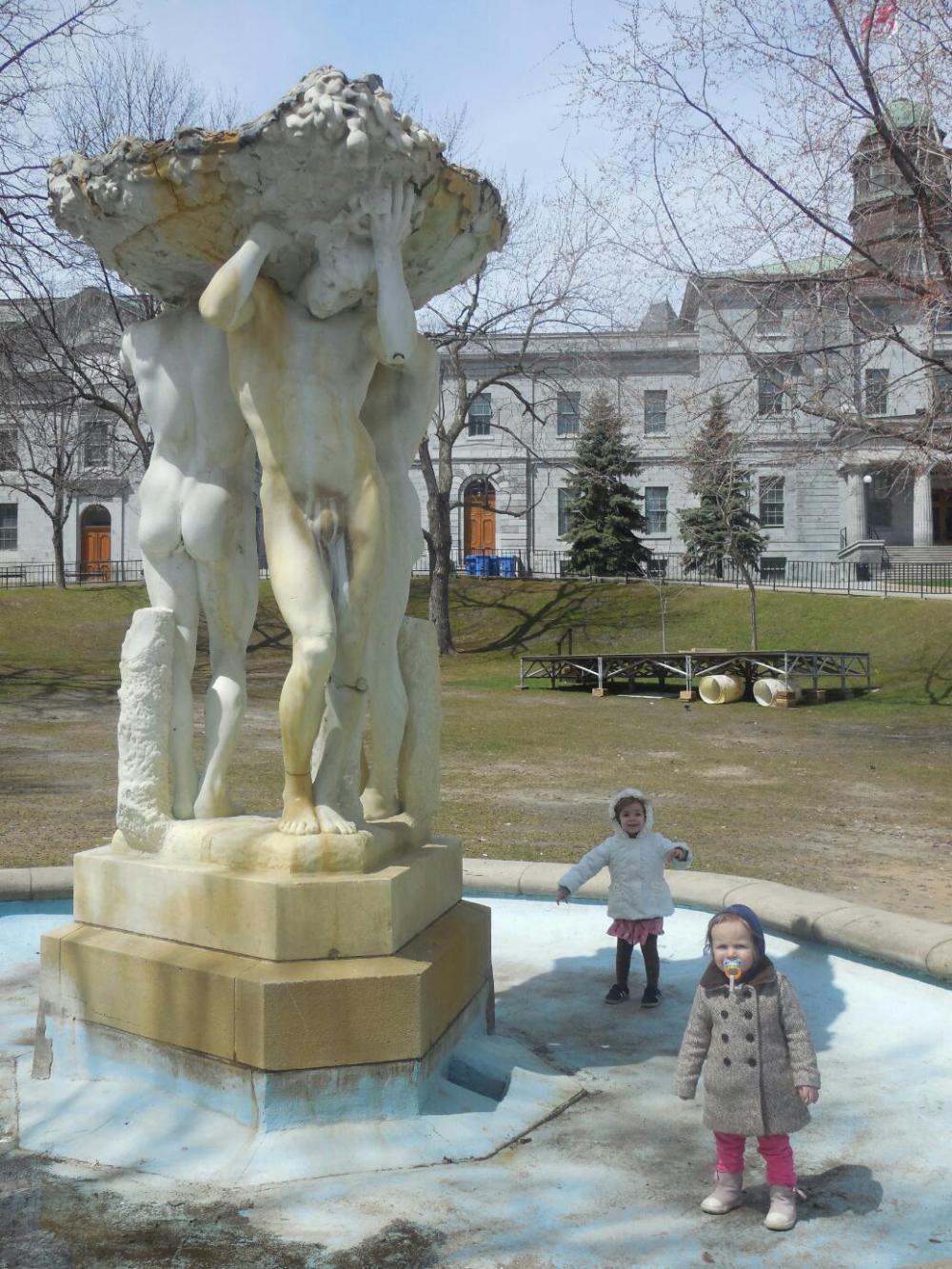 McGill is an English language university set smack in the middle of downtown, on a small patch of green at the foot of the mountain, Mont Royal, that occupies the centre of Montreal island. It happens to be my alma mater, and of course is very historic. I have been reading a little book of Sabrina's : "A Little History of Canada"and I am reminded of how in 1970 troops patrolled the halls, as terrorists fought for the separation of Quebec from Canada. I watched one of my professors try to throw the soldiers out of his building, saying this was a place for learning and not guns.Today, we took Amelia and Evee to the peaceful campus, and they played by the famous, scandalous "Three Bares" statue, near that building.
