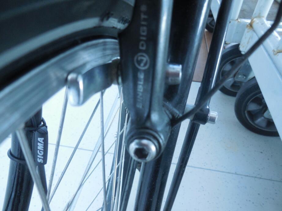 I carried the limp bike bodies to a quiet corner and assessed the damage. The bottom of the bag is the first place to look, for parts that have fallen or been wrenched off. Dodie's bike produced quite a haul. There was a further plastic part from her Ortlieb handlebar bag mount, a snapped formerly sturdy zip tie, and a brake pad insert. The brake pad shell was scrapping along the rim and one brake spring was popped away from its retainer. It was easy to see what had happened.. The bike had been sent with its brakes applied and secured with a velcro tie. The wheels had been zip tied to be further motionless. But someone had dragged the bike forcefully backwards. With the brake applied by the velcro tie, the wheel had nonetheless rotated, backwards, breaking the zip tie and forcing the brake pad out the back end of the pad holder.