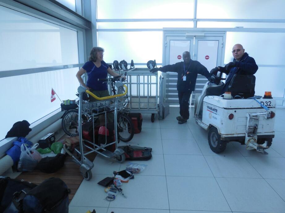 It actually took a few hours to get the bikes repaired and totally in shape for riding again. By this time, the arrivals hall had emptied of people. Actually it had emptied and filled a few times. We kind of got to be a familiar fixture in our corner for people who worked in the area. Three of these were men who were jockeying luggage carts about. They asked us about our trip, becoming the first UQ people or this tour. Later, they advised us on what roads to take to get out of the airport area. And later they gave us an encouraging toot toot as they passed in an official truck, on one of those roads. Conversely, once I had changed into my cycling outfit - which includes a reflective vest - I got stopped and chided (at first) by another employee - for not displaying my airport ID properly around my neck.