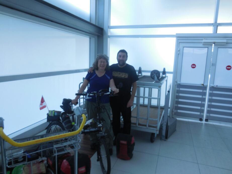 The bikes popped out at the oversized baggage chute at Charles de Gaulle airport quite promptly, and before most regular luggage arrived. One bike in a box came before our two in plastic. The box was ripped to shreds and obviously had been no more protection than our flimsy plastic bags. The bags in fact were slightly more intact than they had been when coming off the flight from Victoria to Montreal. Still, they were ripped enough. Handlebars poked through holes, and other parts of the plastic flapped uselessly.