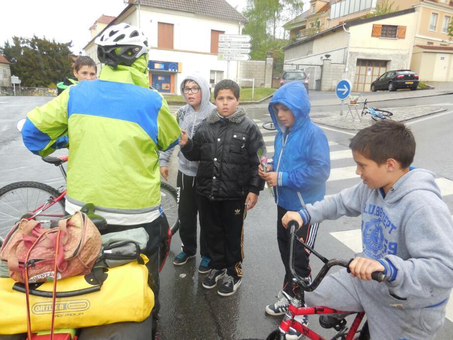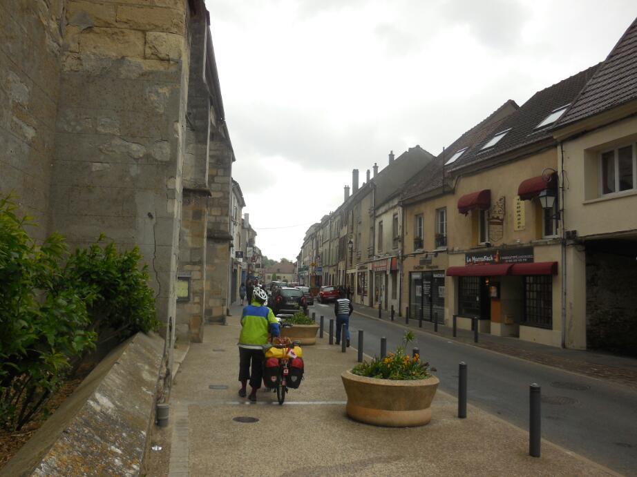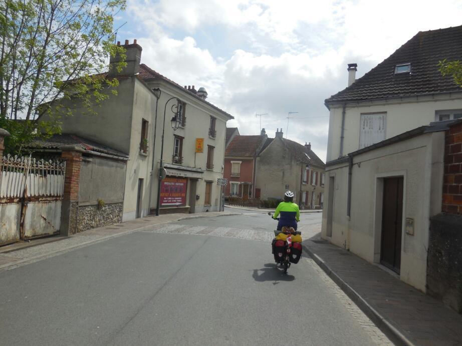 We of course arrived in Crepy quite quickly. Our informant had told us to turn right onto D1324 to find the hotel. We did do that, but first the intrepid travellers forged straight through the town gates, called the Paris Gates, for a look at downtown. A Lilly of the Valley seller rushed across the street and insisted we accept a small bouquet. Dodie declined, saying she had not room on the bike, but I took it and stuck the bouquet my handlebar bag mount. After we had checked out the town we swung around and headed back to our turn for the hotel. This brought us past the flower seller again. This time he stopped traffic and carried a bouquet to Dodie. This time she graciously accepted. Had to. This event was just one through the day, where people had smiled and waved and encouraged us universally. So nice!