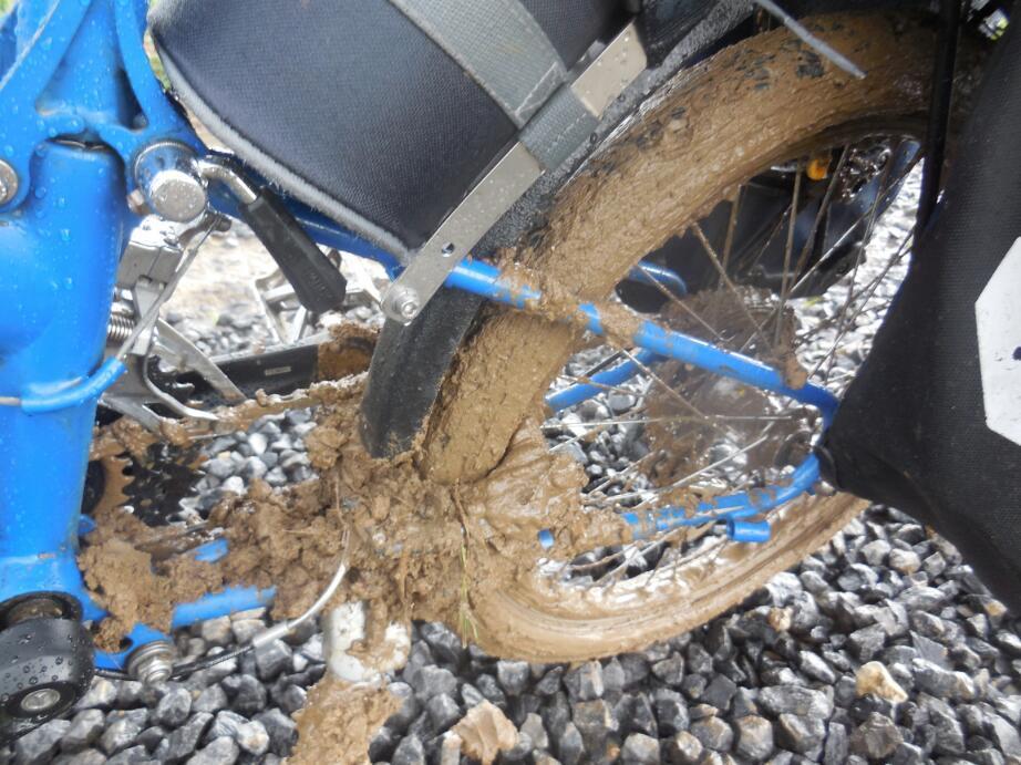 After a while the gravel road deteriorated to a two rut track. Ah, did I mention that earlier, much earlier, our appearance in the region had brought torrential cold downpours. These had now settled down to routine drenching cold rain. The two rut track deteriorated to a grassy one rut track. This was not ride able, but we had already come so far, and the GPS was dead sure about this. So we pushed the bikes onwards. We pushed for many kms! Our courage turned to standard dumb Grampie stubbornness, and we carried on in the rain, until the grassy track turned to a muddy track. Now the tires picked up the gluey mud and included small rocks and twigs, and pushing became harder and harder. I put my hand behind the seat and pushed on, harder and harder.