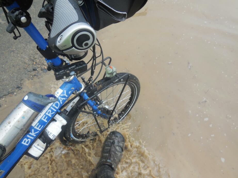 Finally we could push no more, and took to cleaning out our wheels with the staff of our Canadian flags. This had turned into a bloody WWI muddy trenches situation! We finally pulled, lifted, and dragged our now 1000 pound mud laden bikes to an actual paved road of some type. Just where the track entered the road was a deep muddy puddle. We waded into this in our merino sock and sandal clad feet, and commenced kicking water over the stricken parts of the bikes. We kicked and flag poked and then finger poked for a long time, until finally the bikes were mostly rideable. So then we sailed on into the town by the paved road. It turned out to be "Ognes", indicating we had pushed about 15 km!