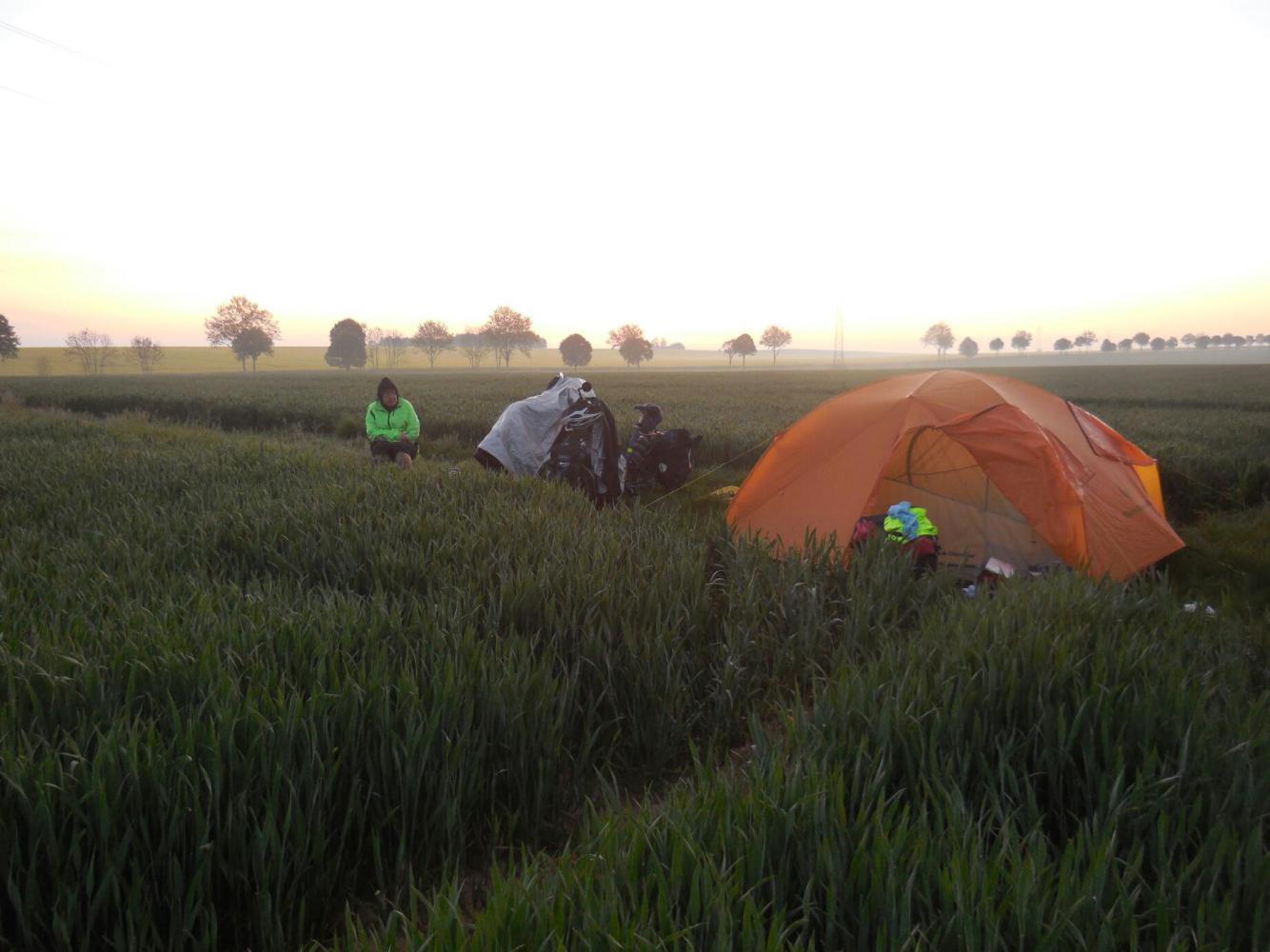 This morning there was ice on the tent wë had to wear our gloves to pack up. I hate mornings! On the other hand, we kind of asked for it, by starting at 5:30 a.m. I guess there is also a perverse pleasure in watching the temperature gradually rise on the bike computer, and feeling the pain slowly leaving the fingers and toes.Next comes the decision points: Is it time to take off the heavy hoodie? Time to put on the short finger gloves? If you jump the gun, you'll suffer and if you delay too long, same thing. But match your clothes to the weather just right and cycling is fun again!