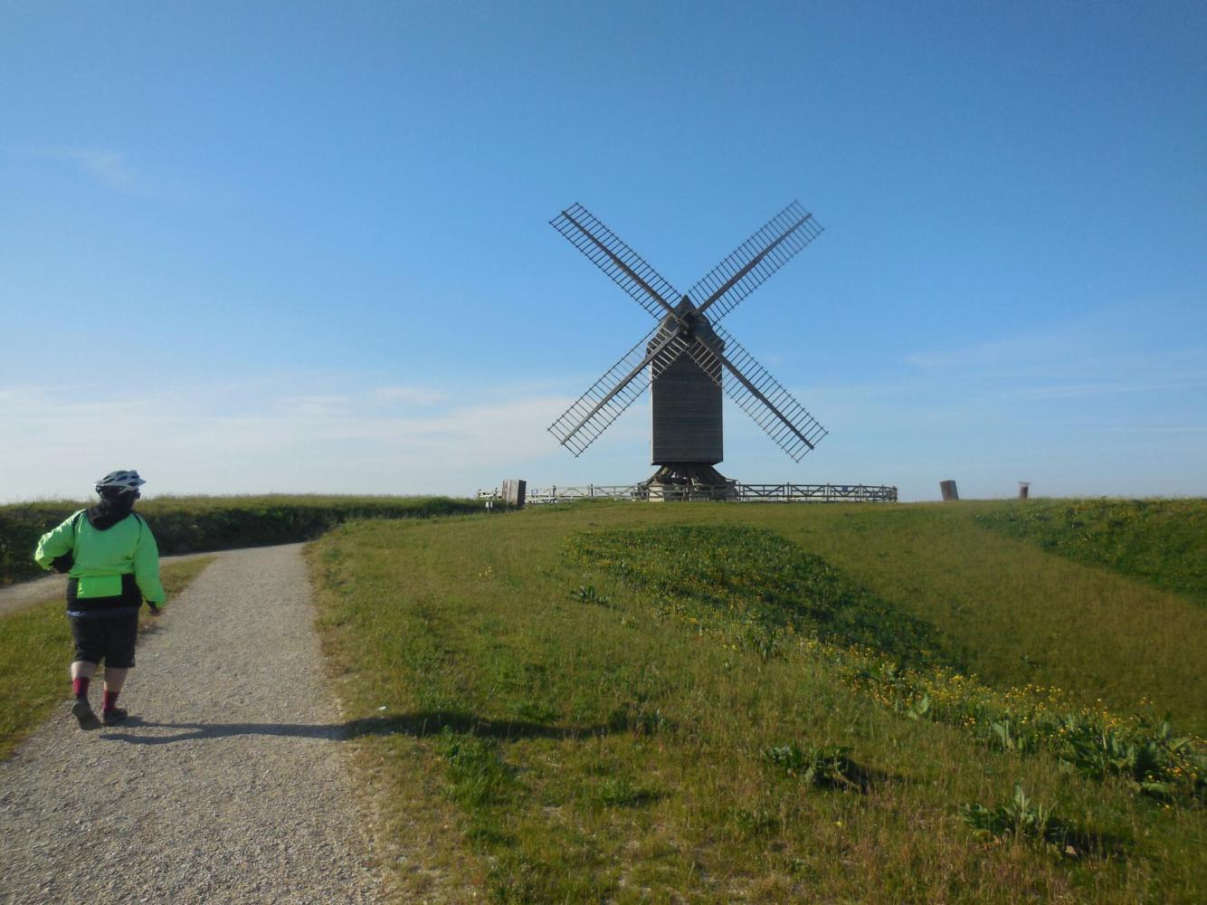 We started out in the green and gold fields, which makes sense, since that's where we left off. However by mid day we had entered the Argonne region, which is hillier and more forested. Just before that was the town of Valmy. It's coming was signaled well in advance by signs about the battlefield and the windmill.