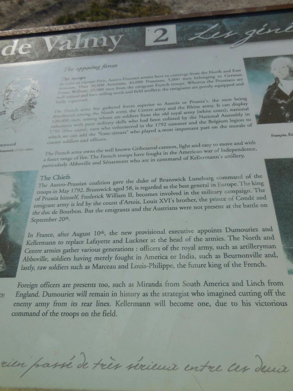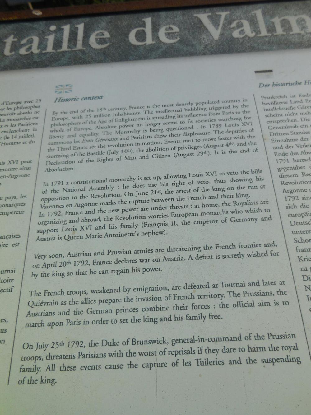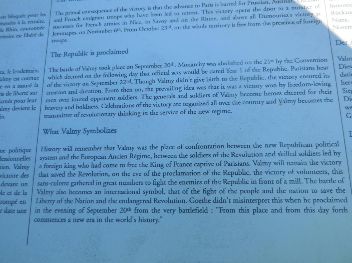In a nutshell, at the time of the French Revolution (1789) the other monarchs of Europe were concerned about the threat to monarchy. By 1792 armies from Prussia and Austria marched into France and headed for Paris, to put things right. French generals confronted them - here, on this hill! In the battle of Valmy the invaders were turned back and the Revolution saved. So that makes this place Valley Forge or Gettysburg or the Plains of Abraham or something like that. It is the birthplace of the modern French nation. The Grampies simply stumbled up it. duh!
