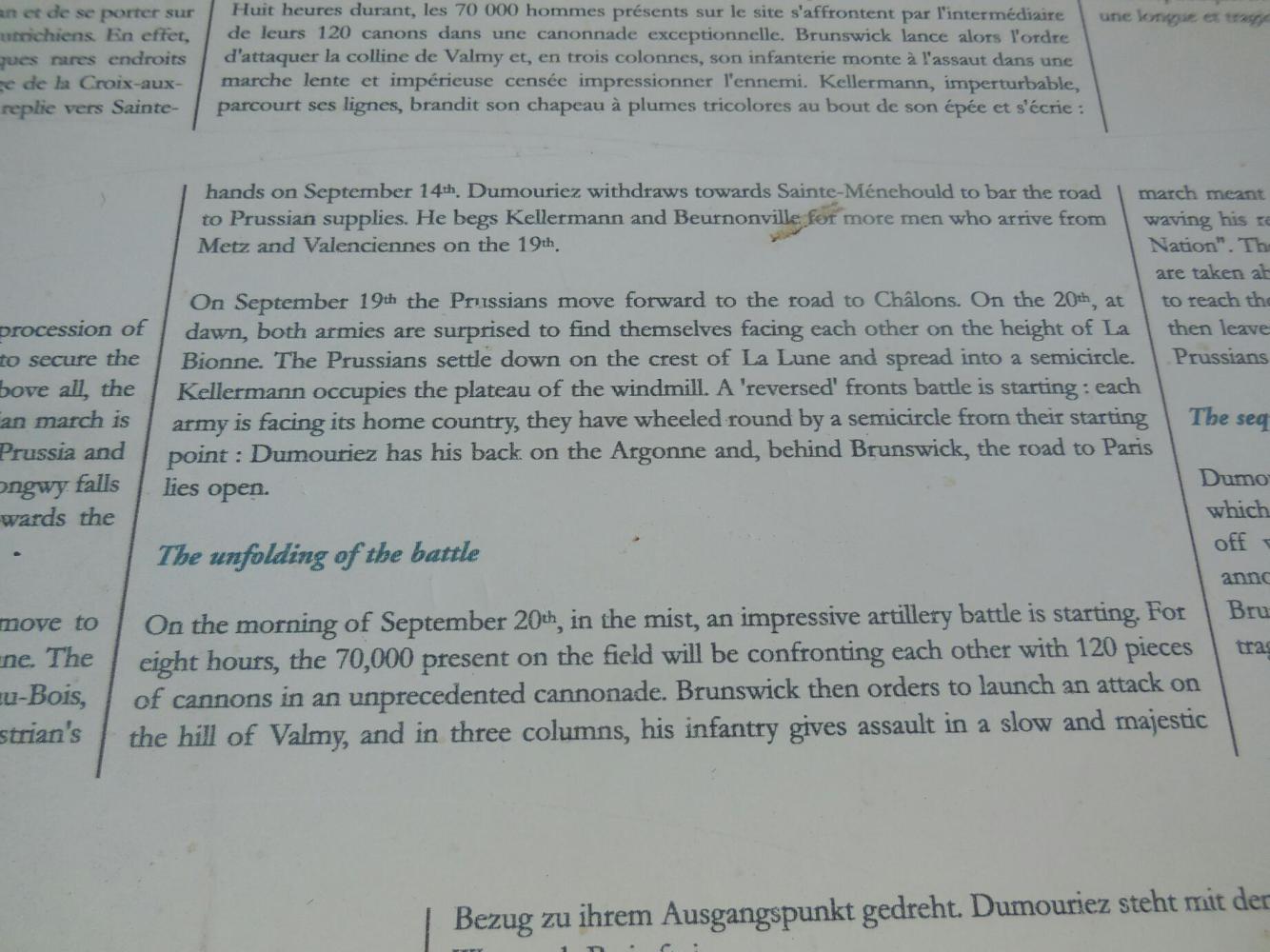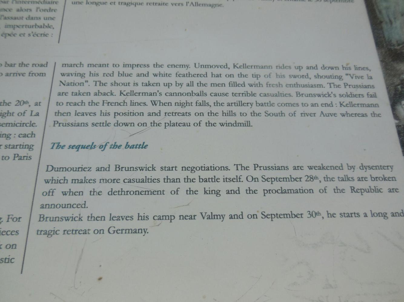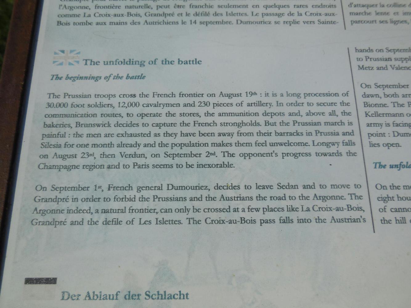 In a nutshell, at the time of the French Revolution (1789) the other monarchs of Europe were concerned about the threat to monarchy. By 1792 armies from Prussia and Austria marched into France and headed for Paris, to put things right. French generals confronted them - here, on this hill! In the battle of Valmy the invaders were turned back and the Revolution saved. So that makes this place Valley Forge or Gettysburg or the Plains of Abraham or something like that. It is the birthplace of the modern French nation. The Grampies simply stumbled up it. duh!