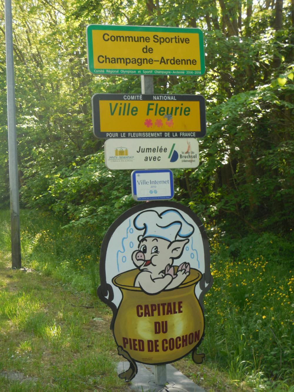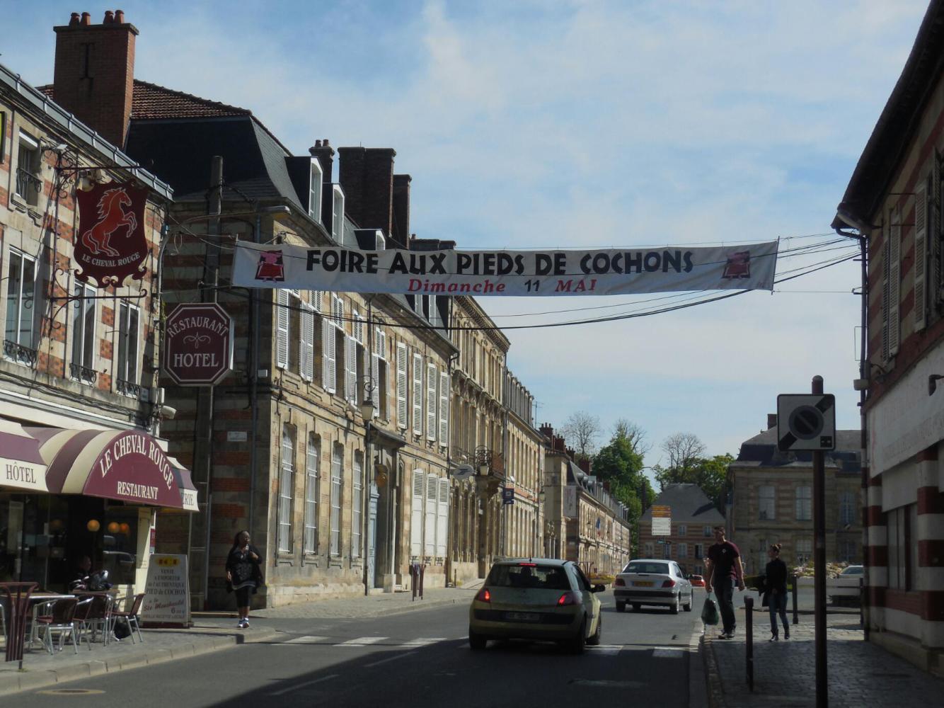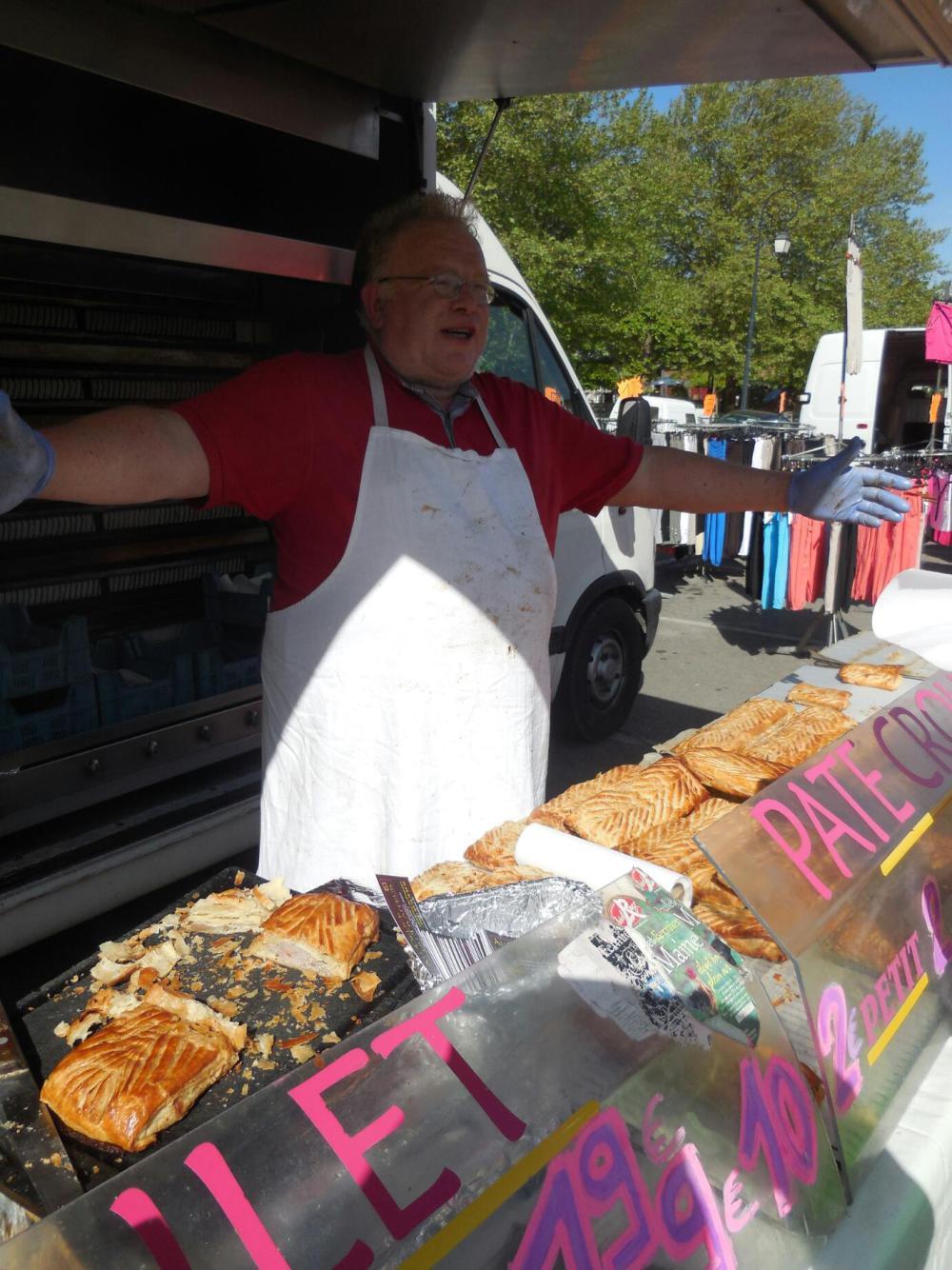 Speaking of eating, it is hungry work learning all this history. And Monday is so close to Sunday that most French business has not yet got around to opening. Or, maybe they are closed to gear up for Friday, which after all is almost Saturday! Looking at the map, it seemed our first chance to find something would be at Ste Menehould. Ste Menehould did not disappoint. First off, they style themselves at the entrance to town as being the pig's feet capital. That's a start, though pig's feet for brunch did not really sound that tempting. In town was something much better - a market in full swing and an open bakery at the edge!