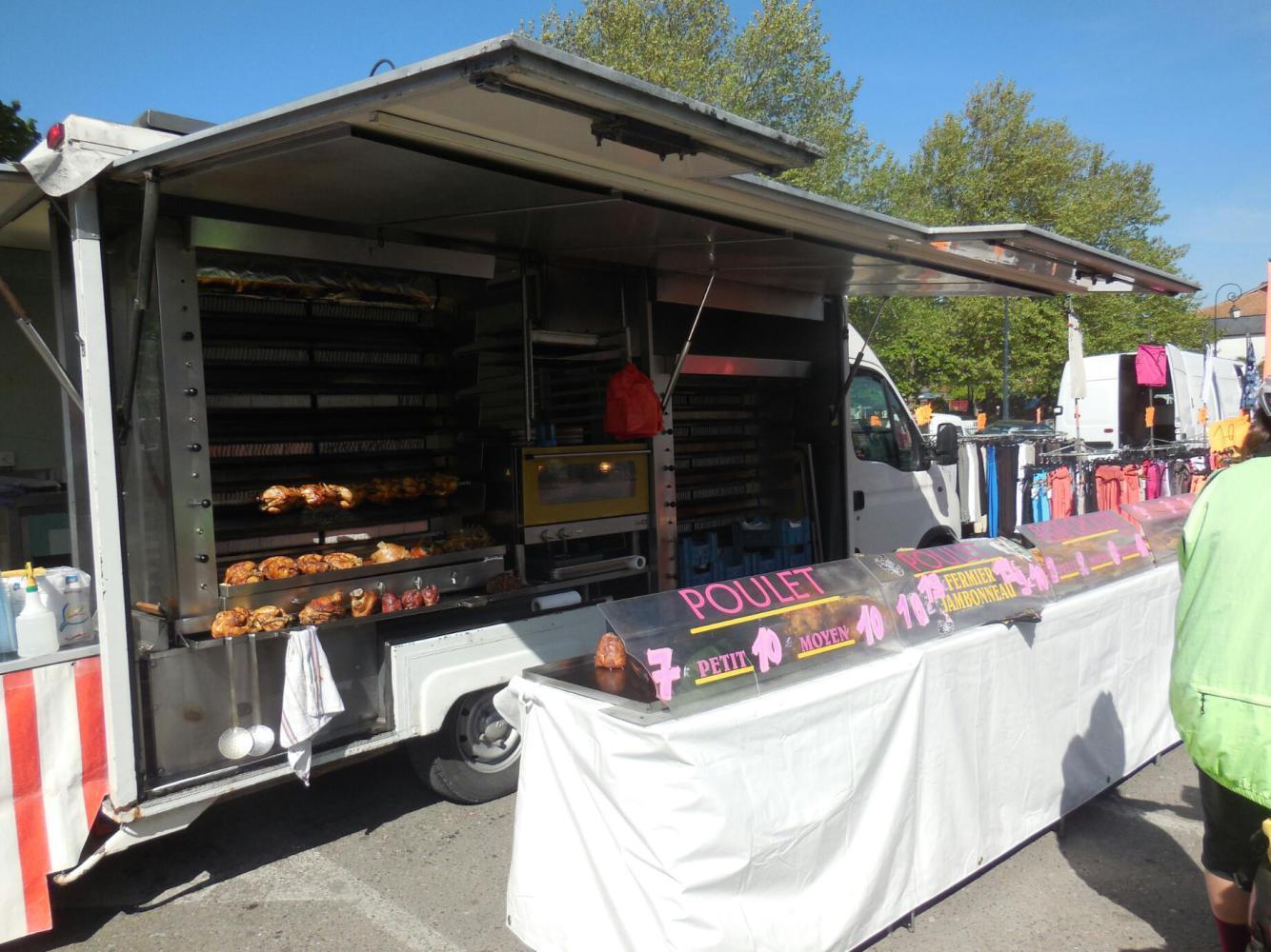 Our first step was to the bakery, where two chausson pommes would supply the energy needed to check out the market offerings. This market, as do many, blended clothing and knick knack sales with produce. So dodie was able to buy a pair of lightweight long pants to help ward off these chilly mornings. But the market's two stars were two chicken BBQ trucks. These had not only chicken but paella, pork, and pate en croute (meat pies).