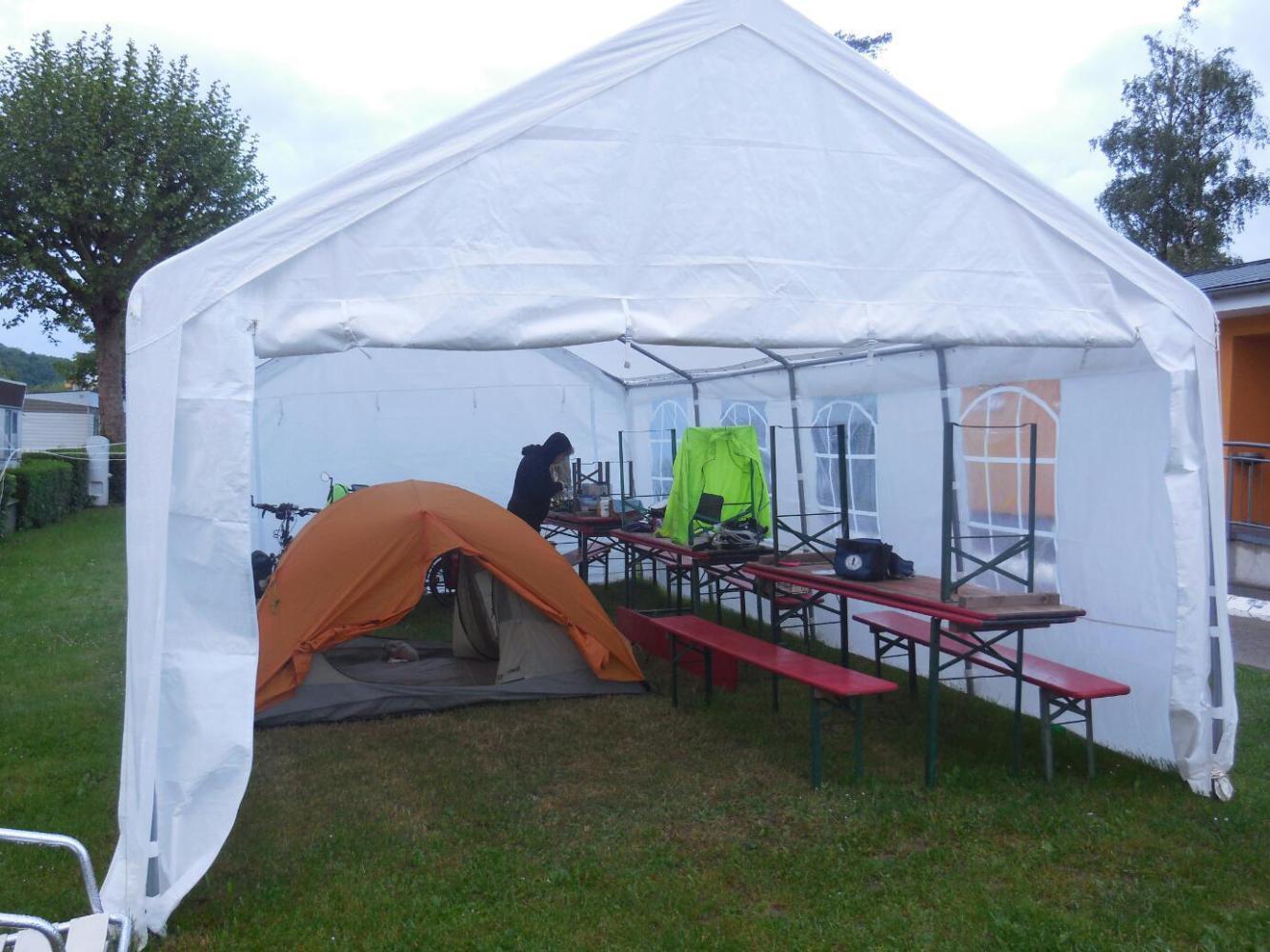 The rain has continued off and on, and was very heavy overnight. However we were quite well protected with our tent under the beer shelter.