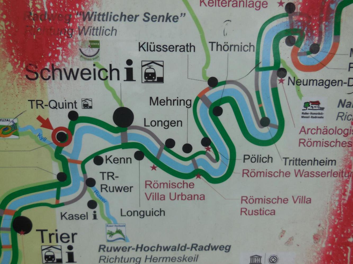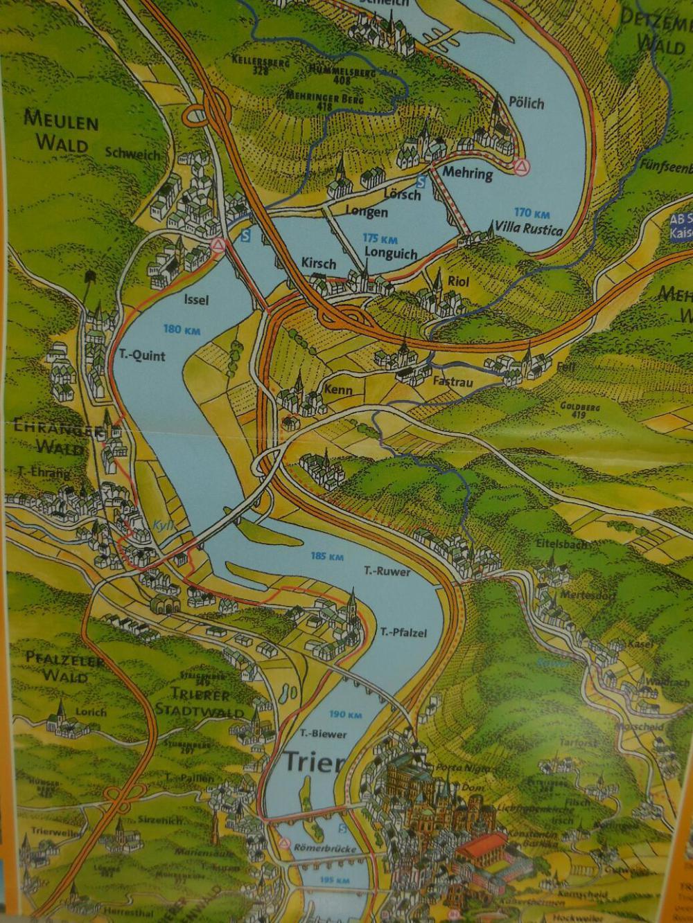 We found a central square, and sat at a bench to eat our tasty sandwiches based on wonderful bread. Adjacent was a book store, and Dodie wandered over to have a look. She came back with a treasure that would have made a great birthday present for me, or for use any time a real treat was in order. It was just 3 euros and it was a just slightly cartoonish map of the Mosel from Trier to Koblenz. I already have a map like that for the Rhine. In my capacity as the tourist at the back of the procession, rather than as the navigator, this is just right for seeing what attractions are coming up. Unfortunately this treasure was just a little big for the map case, so then we had to figure out how not to wreck this most precious of items I also proposed buying another two, one for backup and one for our friends Erika and Marvin who plan to cycle this route. Unfortunately the store only had the one, so now that one has national treasure status, and is protected at the bottom of a pannier, where no one can see it!