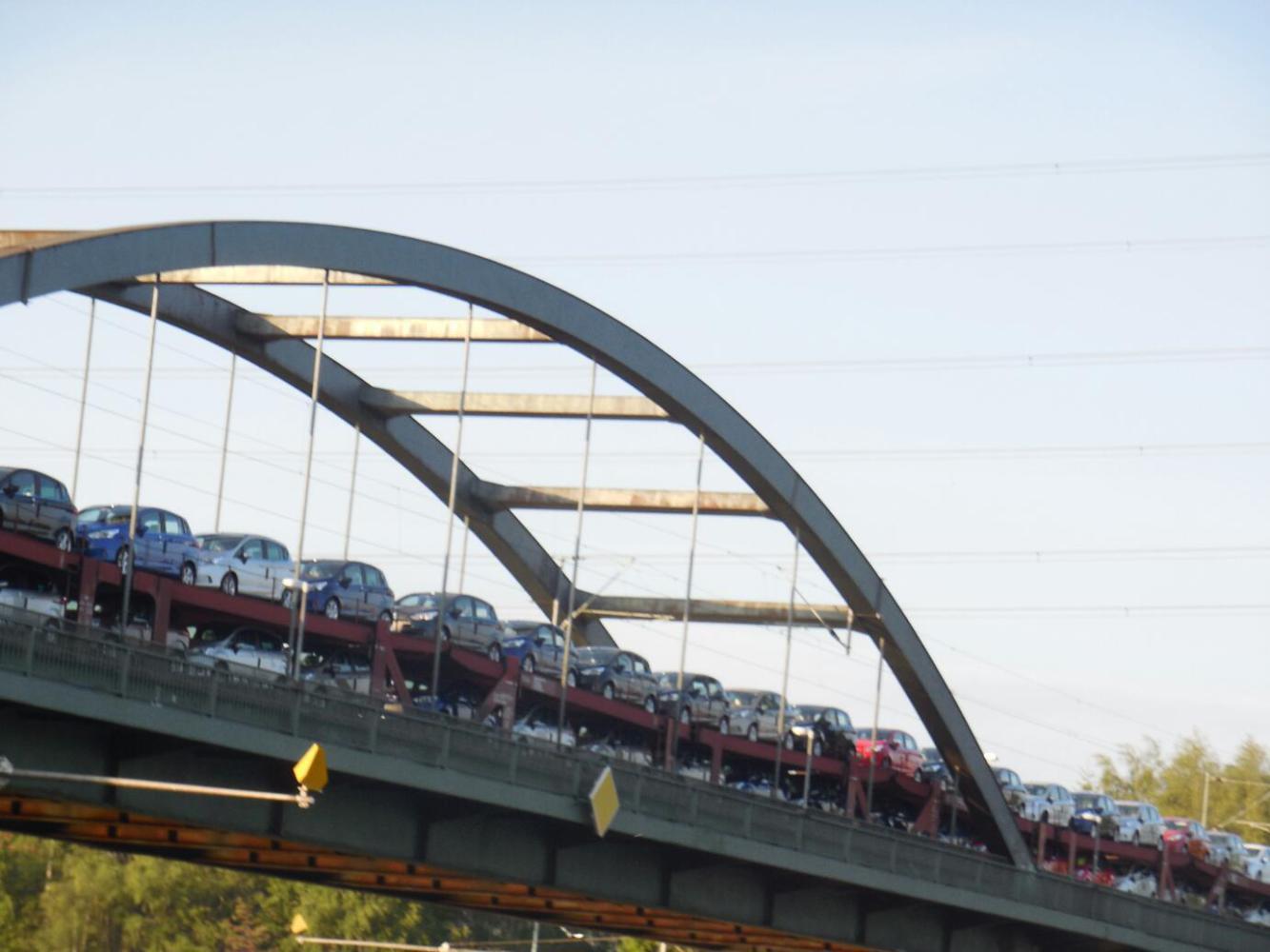 When we came to the first of these panels, I did my usual when faced with a flood of German text - scan it desperately, looking for anything recognizable. Dodie looked at it and said Äh, there was a bridge here with nine arches. It got destroyed and a railway bridge was rebuilt. That meant workers at that new factory across the river had to commute by ferrry. The ferry ran 24/7, until a pedestrian way was added to the bridge." Say what? You figured out all that?? No, dodie had used a different trick - scan the panel for the little British flag, designating a tiny English precis of the whole story. Brilliant!