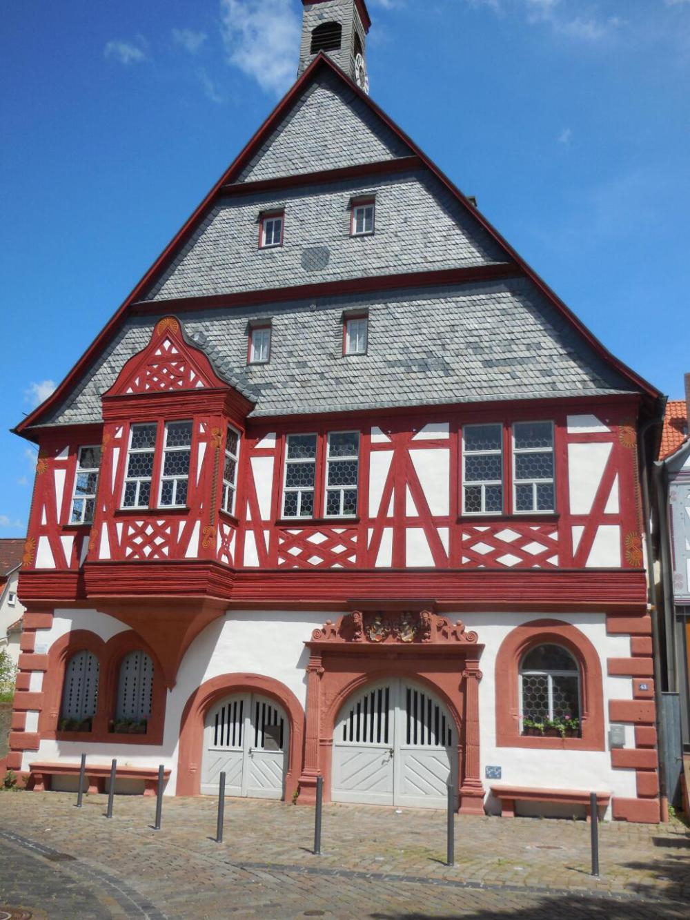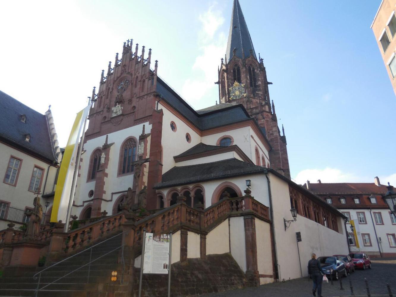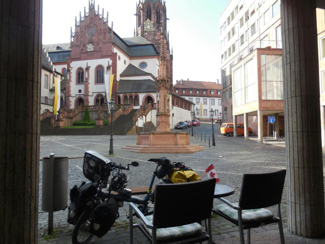 One thing I could see on my map was Aschaffenburg - the major town we pass before Wurzburg. The town has a schloss and and a monastery and in principle an altstadt and pedestrian street. We are sitting now at the requisite bakery in front of the monastry. On our right is the rathaus, so all should be well as this is the standard and desired situation. Unfortunately there are some glitches. The rathaus is a new, square, ugly building. Cars are allowed to chug through the square. Half theother buildings, including this bakery, are new and ugly. (More whining later.. gotta go.)
