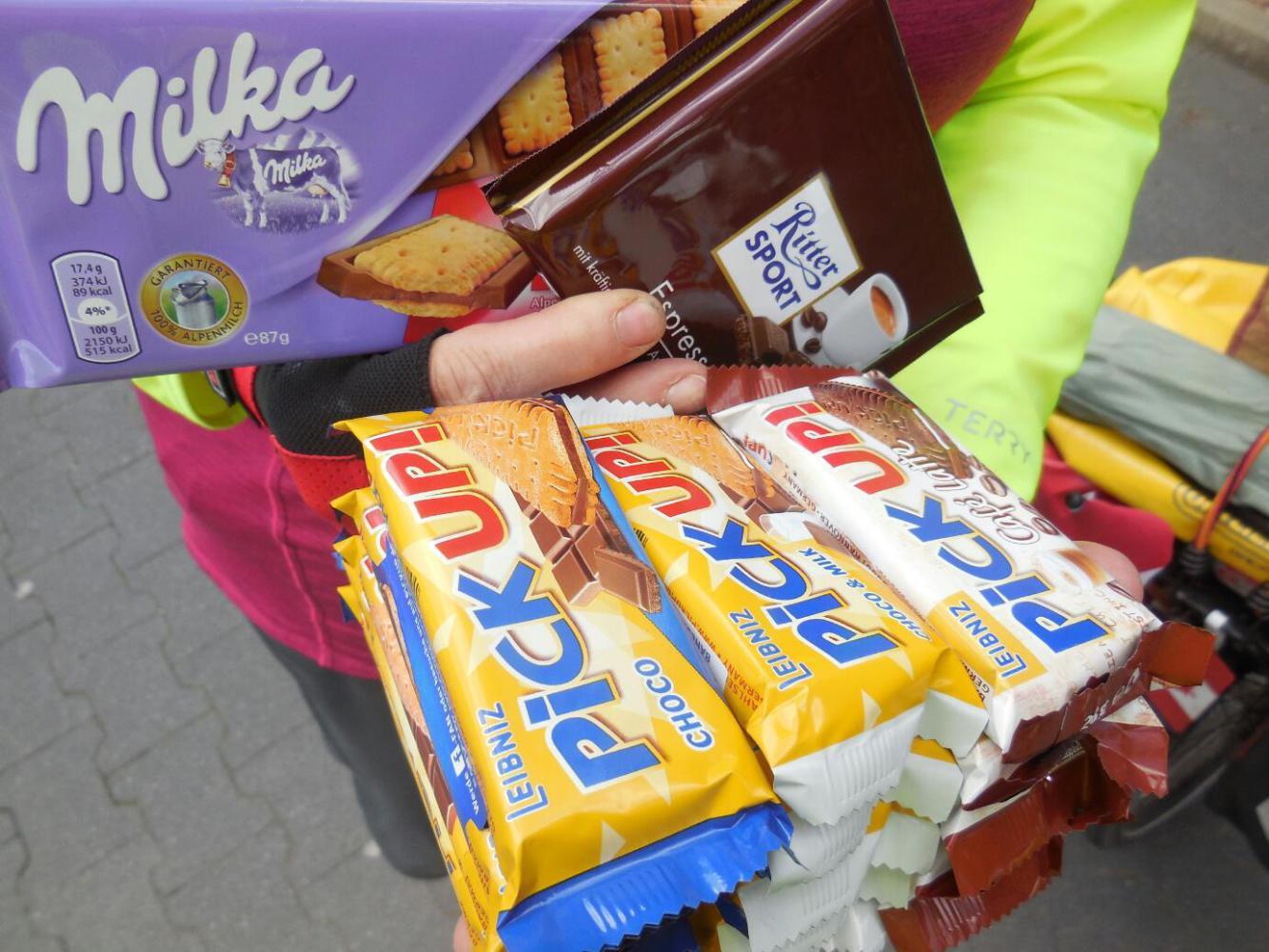 One of the things I was hoping for from Edeka was Knoppers. Knoppers are (IMHO) Germany's premier anti-bonk packaged wafers. It has been a year since we have had any. Without Knoppers, perhaps nothing exciting would come out of Edeka . Dodie returned, with the requisite sacks of oatmeal, and ... no Knoppers. However there was some compensation - a whole pile of Leibniz Pick Ups. Pick Ups are the number two excellent anti-bonk food of Germany. Also in the bag were two ready to reheat pasta dishes, a salad, and an amazing pile of other stuff. The whole cost was €20. Good food (and snack food) is really economical here.