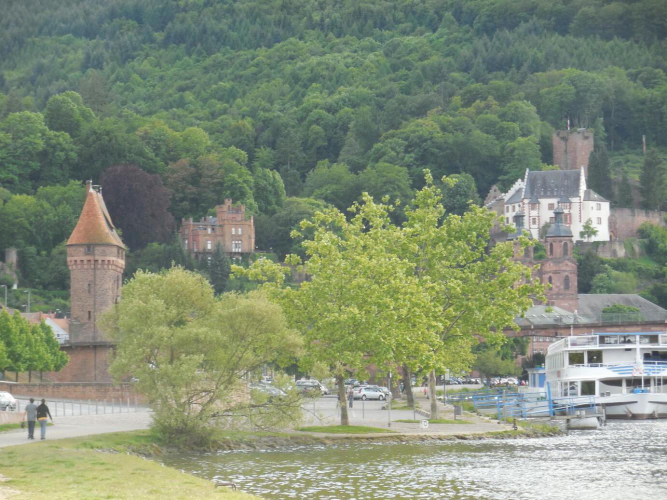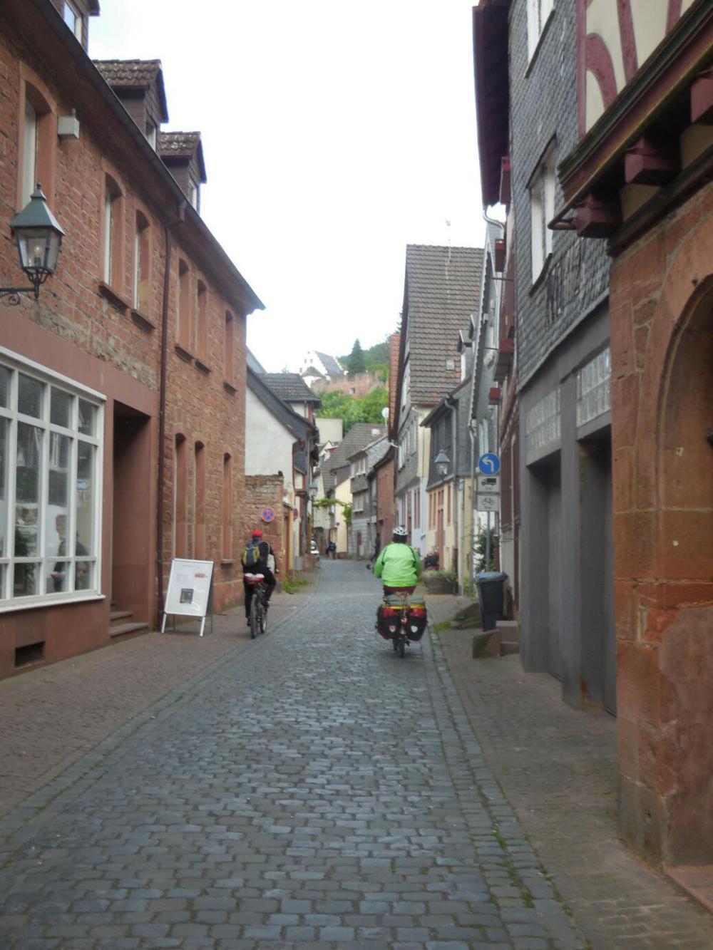 For much of the rest of the day we cruised along immaculate bike path, at or near the river. Every thirty minutes or so we passed another town. Each one had some really appealing parts that we saw, and no doubt lots else of interest that we would have seen had we stopped to investigate. None of the towns seemed to possess the drop dead gorgeous, don't even have to look for it beauty that we had seen along the Mosel. But even if they were not in Mosel's league, they were still super. An exception to this, a standout town, was the last one we entered: Miltenberg. The bike path had followed a car road for a bit, but then veered off down a cobbled old street that was really picturesque. The town also had an ancient gate, that we passed through, and a castle on the hill.