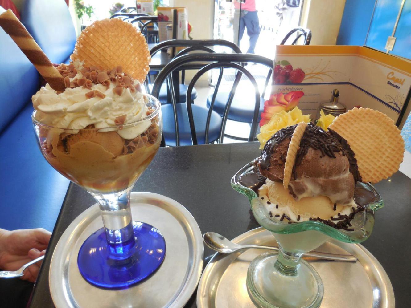 At the risk of giving the impression that we are really pigging out over here, I will admit that we repaired to the eis cafe to drown our sorrows in chocolate or caramel sauce. I took the requisite photo of the two cups. There was a suggestion that we could "fudge" the photo to help preserve our reputations, by only showing one cup. Fudge really was a bad choice of words, though.