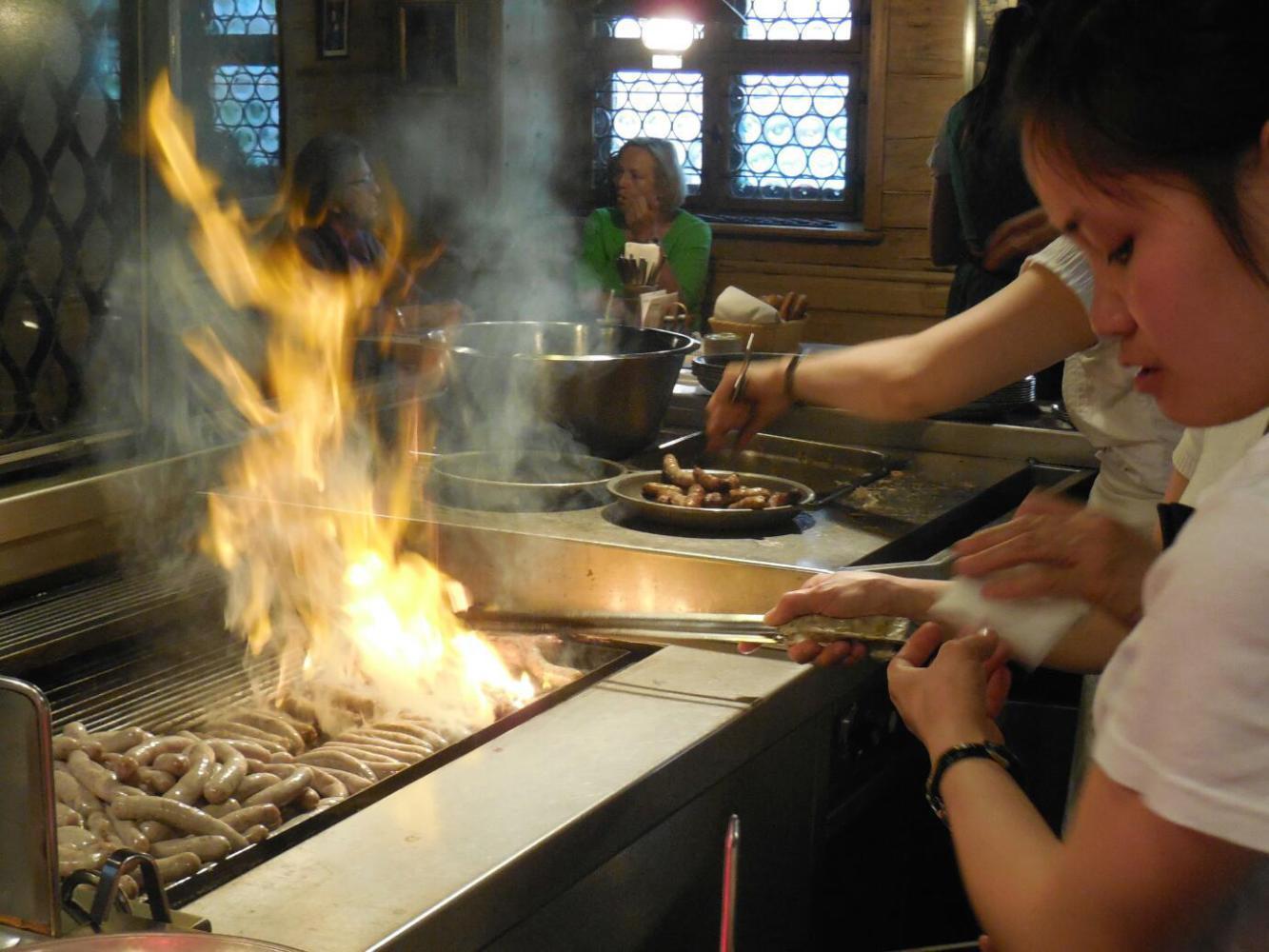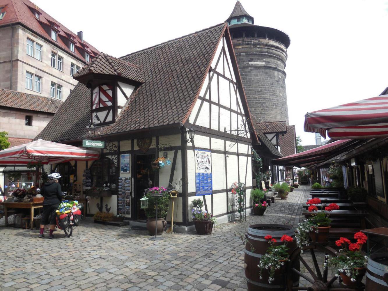 One of the things that Rick Steeves had mentioned were the famous (apparently) Nuremberg bratwurst, known for being the smallest. We spotted one nondescript bratwurst restaurant, and wondered what Rick Steeves had been going on about. However, deep in the market square, near the Frauenkirche, was a building with a whole lot of smoke coming out the top, and a whole lot of people seated inside and out. A sign offered take out bratwurst, 3 in a bun for 2.50. I made my way inside and found a very busy scene, with waitresses scurrying around, and lots of people.In the centre was the grill that was pumping out the smoke, and on the grill were hundreds of little bratwurst. At this point I had what I consider the honour of being gently bulldozed out of the way by a large dirndl clad waitress. I asked a less imposing one just how to buy some bratwurst, and got a quick instruction in German. Sort of following that, I presented myself to a little bar, and got directed to the side of it, also in German. There a lady took my 2.50 and scribbled something on a chit. Now what. More fast German instructions. I presented myself back near the grill and waved my chit. This had the desired effect of producing three little bratwurst on a bun. I was bold enough to ask were the senf (mustard) was, and somehow understood those instructions. So after that I was back on the street where Dodie was waiting with the bikes, with my treasure. And yes, they were good.