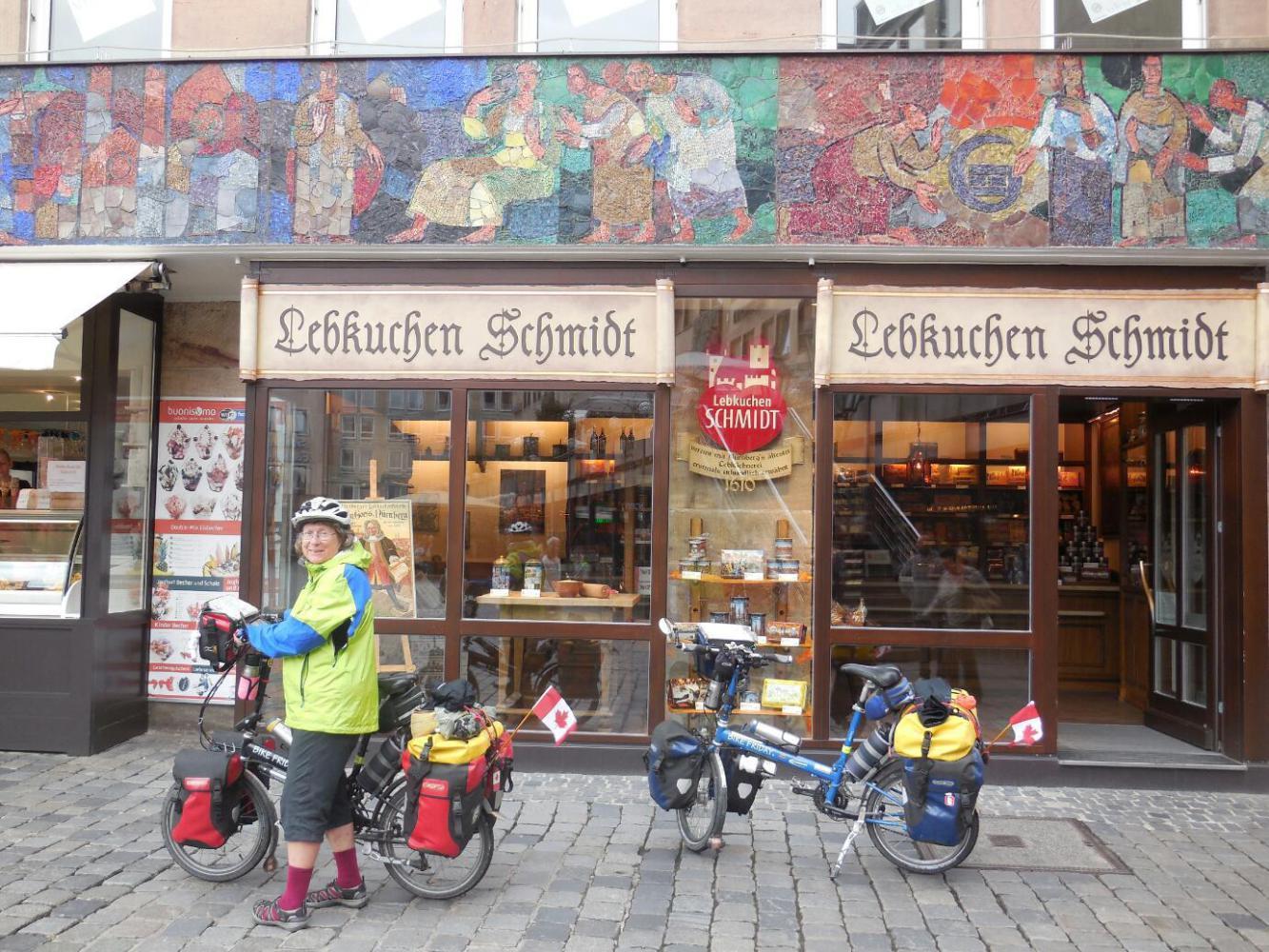 One thing always found in city sections like this are eis cafes. When the first one came up, Dodie said "No way. We have to stay out of these places. We are gaining weight on this tour!". Good sentiments, but they fell apart within 30 seconds. It was not some super eis cafe that did it. It was Aunt Greta. Aunt Greta, the sister of Dodie's dad, had long ago moved to the US from Germany, but still managed to send the family Lebkuchen every Christmas. These cookies found a special place in Dodie's heart. Now lebkuchen are not exactly cookies, they are cakey things, often chocolate coated, and kind of gingery. Back home, we buy them a fair bit during the holiday season. They are "pretty good".