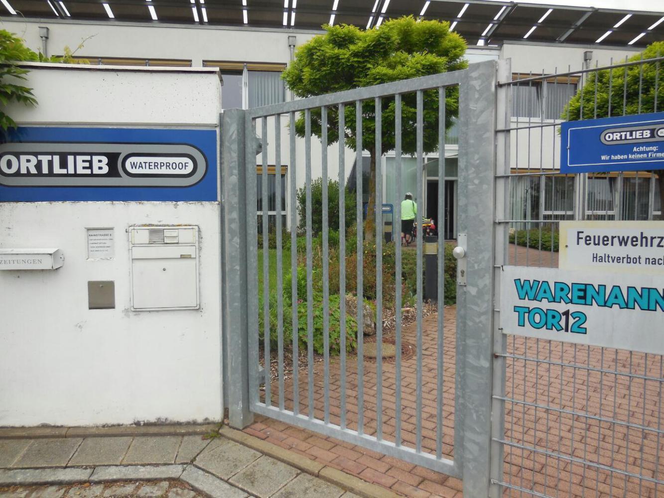 We had no idea what we would find at the Ortlieb factory - whether a retail outlet, a showroom, or perhaps a factory with nothing there for us. We walked in and introduced ourselves as cyclists from Canada to the receptionist. She made a phone call, and we were quickly introduced to Andrea, a lovely person from the export department. Andrea greeted us very warmly, and brought us through to a show room. From the start we were made to feel not like an intrusion but like a welcome arrival. Ralf from marketing came out and took a photo of us with the bikes, and we were given a gift of two Ortlieb branded Buffs - which is a stretchy knit tube that can be worn on your head in various ways.