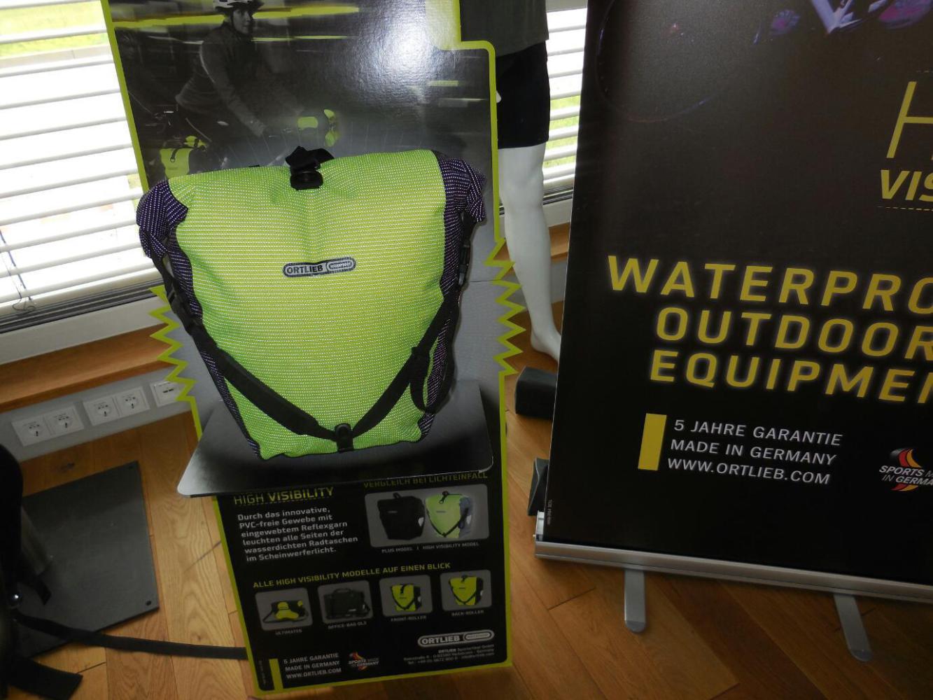 The show room we were in was filled with the now mind boggling variety of Ortlieb bags and packs, many of which we had never seen before. Among these were ones in an all yellow refective material (great idea), and bags made from polyurethane (PU) rather than PVC. Andrea went into some detail about the reasons (or not) that one would want to use PU. Again, we were much impressed by the forthright and clear explanations.