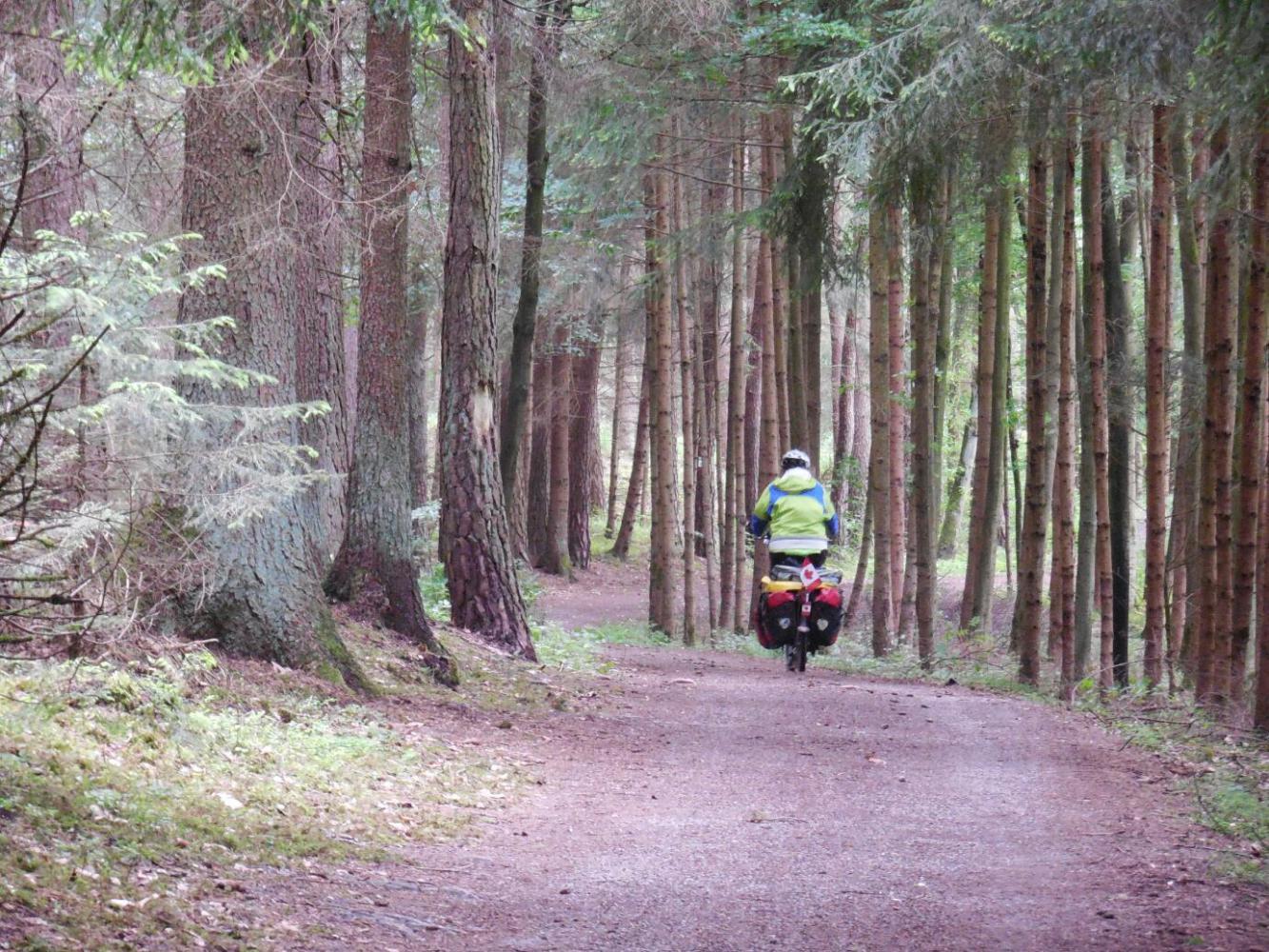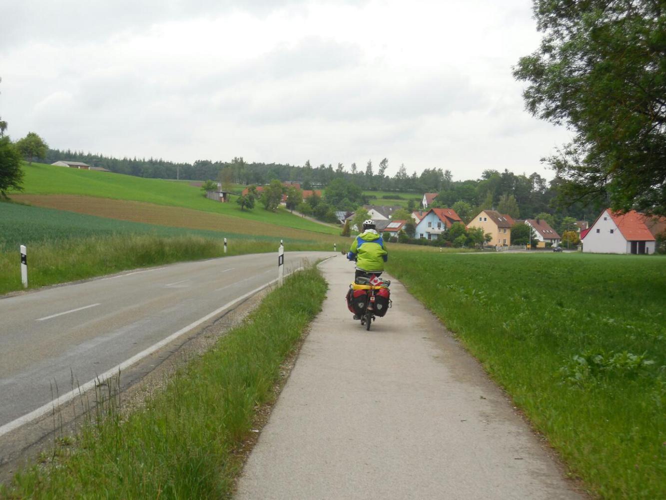 This was the second day in a row in which we battled quite heavy headwinds. It made us think that perhaps we would not reach Rothenburg today at all. But, we plowed on. The way led from village to village to village, running up and down gentle folds in the land. The path was sometimes paved cycle way, but more often it was fine gravel, or with the cars but on very quiet roads. We were closing in quite nicely on Rothenberg, when we ran in to our second chance to talk to someone about long distance cycling. It was a fellow from Netherlands, about our age, heading for Turkey (and back). We had a great time thinking about routes to the east, and different routes back again, while we pedalled on a bit. When we had said goodbye to our new acquaintance we found that we had missed some turn in the radweg signs were were following, and we were in a blank spot as far as .gpx files we had downloaded went. So we used to the GPS to bushwack our way into Rothenberg. It worked out, but we had wasted some time and distance.