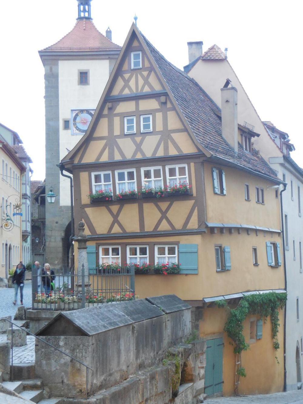 We got to Rothenburg and passed reasonably quickly through the ring of modern ugly development that always surrounds old cities. Then we entered the old city, through a tower gate, or course. We were prepared for Rothenberg being the jewel of the Romantische Strasse, and we found that there is no exaggeration in that. The place is stunning, interesting as all getout. Since it was getting late, we wanted to find a place to stay asap. Best would be to find the place recommended by the Aussies. We showed the photo we had made of the postcard to some tourists, and they instantly recognized the spot. It turns out to be the most photographed spot in the town, and the shot that graces the city's main advertising pamphlet. This all allowed us to quickly find the subject guesthouse. It is just by a gate in the city wall, and is built hard by the wall. So when we look out out window we can easily see any invaders, planning to lay siege to the city.
