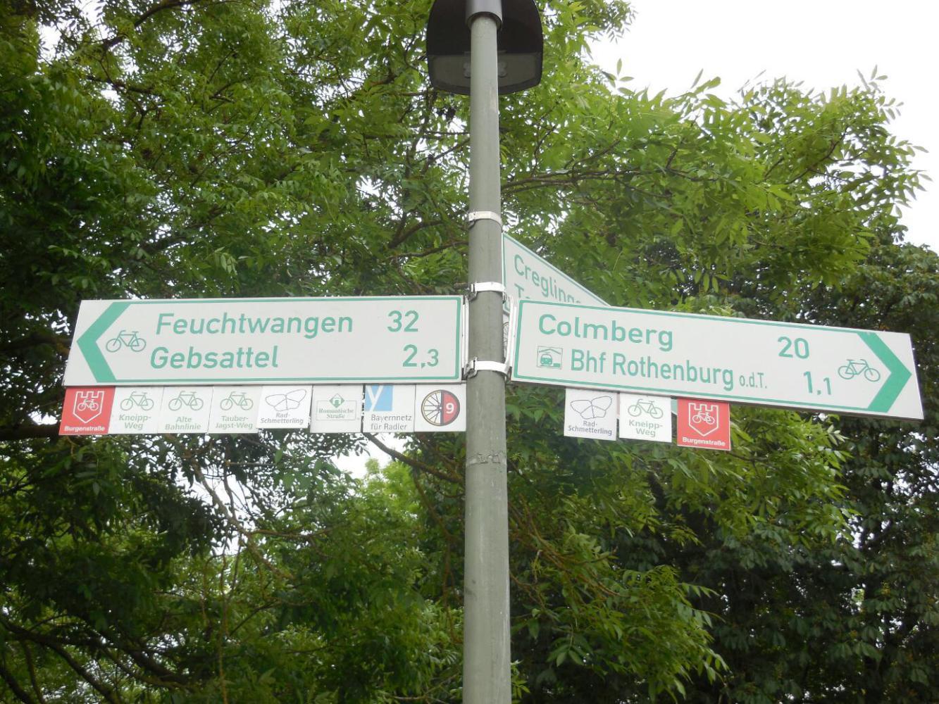 The Romantische Strasse, naturally is not just an advertising concept, but also a signed route, one for bicycles and one for cars. So we made the acquaintance of our new sign, that we would be looking for on the signposts. As usual, there are lots of bikeways, going every which way and often sharing a route with others for a while. Our first sign had not only the standard green on white direction indicator to the next large town - Feuchtwangen - but also the indicators for seven or eight other routes aside from our own.